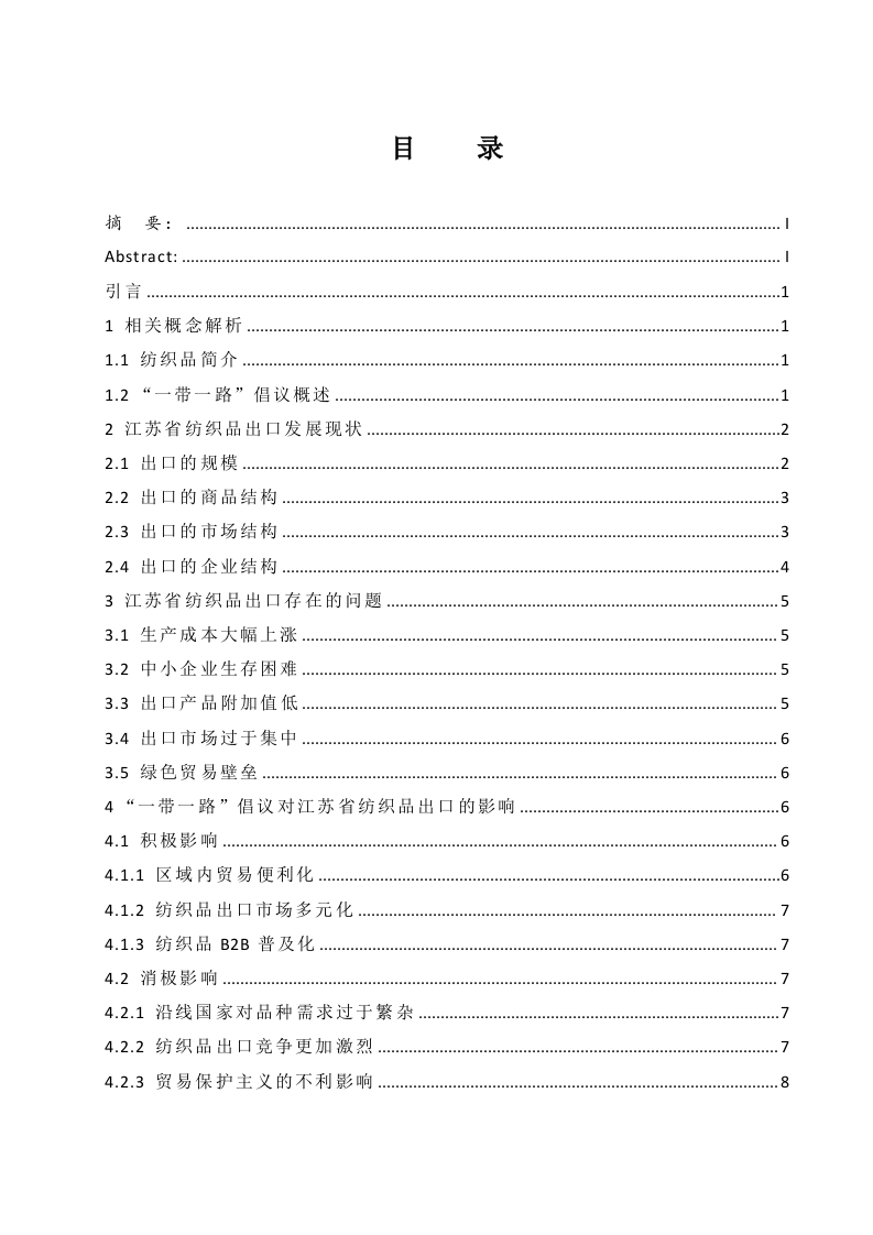 目录摘要:Abstract:…引言1相关概念解析…1.1纺织品简介…11.2“一带一路”倡议概述2江苏省纺织品出口发展现状2.1出口的规模2.2出口的商品结构…2.3出口的市场结构.…2.4出口的企业结构…3江苏省纺织品出口存在的问题3.1生产成本大幅上涨…53.2中小企业生存困难53.3出口产品附加值低3.4出口市场过于集中.…63.5绿色贸易壁垒…4“一带一路”倡议对江苏省纺织品出口的影响4.1积极影响…64.1.1区域内贸易便利化64.1.2纺织品出口市场多元化…74.1.3纺织品B2B普及化…74.2消极影响…4.2.1沿线国家对品种需求过于繁杂…4.2.2纺织品出口竞争更加激烈.…74.2.3贸易保护主义的不利影响.85“一带一路”背景下江苏省纺织品出口发展对策5.1提高生产效率降低成本.5.2中小企业整合资源发挥自身优势5.3加快产业升级增加附加值…5.4优化出口市场结构.95.5积极应对绿色贸易壁垒…9参考文献…10致谢一带一路背景下江苏纺织品出口发展对策分析摘要:江苏省纺织行业发展至今已有100多年的历史,早在19世纪末期江苏省就创办了中国第一家私营的棉纺织企业。江苏省地理位置优越,原材料充足,生产条件极为便利,纺织品的生产总量在全国一直名列前茅。同时江苏省进出口贸易发达,生产的纺织品大量出口到了其他国家,纺织品的出口量占比最大约为20%。近年来“一带一路”侣议的提出,为江苏省纺织品的出口带来了更多的发展机遇本文从江苏省纺织品的出口规模、出口产品结枸和出口市场结枸这三方面对纺织品出口现状进行比较并加以分析,清晰系统地认识到江苏省纺织品出口发展受阻的原因,如企业生产成本上涨、出口产品附加值低、出口市场过于集中、绿色贸易壁垒等,在综合各种利弊因素的基础上,结合一带一路背景提出江苏省纺织品出口发展对策,以此来促进江苏省纺织品出口发展和江苏省经济的进步。关键字:“一带一路”侣议:江苏省纺织品The Belt and Road Initiative Jiangsu textile export developmentcountermeasure analysisAbstract:The textile industry in Jiangsu province has a history of more than 100 years.As early as the late19th century,Jiangsu province established the first private cotton textile enterprise in China.Jiangsu provincehas superior geographical location,abundant raw materials and convenient production conditions.At the sametime,Jiangsu province has a developed import and export trade,and a large number of its textile products areexported to other countries,and the textile exports account for about 20%at most.In recent years,the proposalof"One Belt And One Road"has brought more development opportunities for the textile export of JiangsuprovinceThis article from the export scale and export product structure and export market structure in Jiangsu provincetextile export situation were analyzed,clear and systematic understanding to the Jiangsu province textileexport of arrested development reasons,such as enterprise production costs rise,low added value of the exportproducts,export market is too concentrated,the green trade barriers,etc.,on the basis of the comprehensiveadvantages factors,combined with area have a background in Jiangsu province textile export developmentcountermeasures,in order to promote the development of textile export in Jiangsu province and Jiangsuprovince economic progress.Keywords:The Belt and Road:Jiangsu province exports