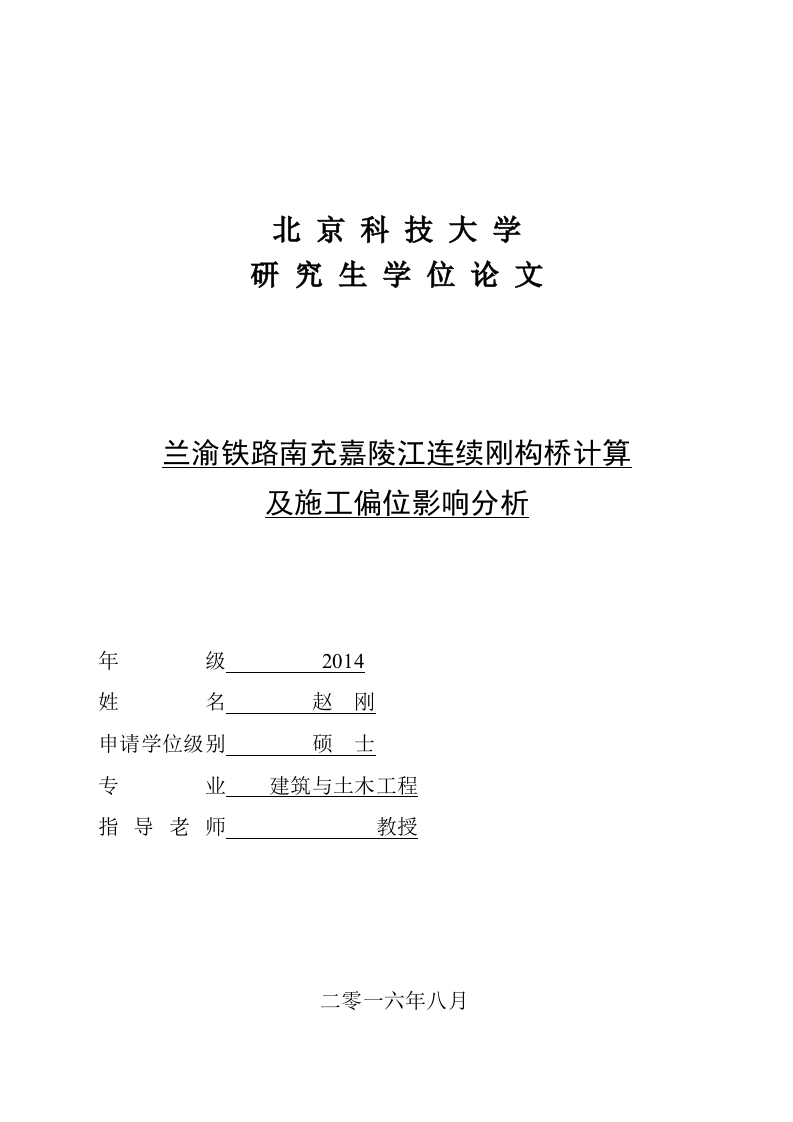 北京科技大学研究生学位论文兰渝铁路南充嘉陵江连续刚构桥计算及施工偏位影响分析年级2014姓名赵刚申请学位级别硕士专业建筑与土木工程指导老师教授二零一六年八月University Of Science &Technology BeijingMaster Degree ThesisTHE SIMULATION CALCULATION ANDCONSTRUCTION DEVIATION IMPACTANALYSIS OF RAILWAY PRESTRESSEDCONCRETE CONTINUOUS RIGID FRAMEBRIDGE OF THE JIALING RIVER INNANCHONGGrade:2014Candidate:Zhao GangAcademic Degree Applied for:Master DegreeSpeciality:Architectural Civil EngineeringSupervisor:Prof.August.2016北京科技大学学位论文版权使用授权书本学位论文作者完全了解学校有关保留、使用学位论文的规定,同意学校保留并向国家有关部门或机构送交论文的复印件和电子版,允许论文被查阅和借阅。本人授权北京科技大学可以将本论文的全部或部分内容编入有关数据库进行检索,可以采用影印、缩印或扫描等复印手段保存和汇编本学位论文。本学位论文属于1.保密口,在年解密后适用本授权书:2.不保密口,使用本授权书。(请在以上方框内打“V)学位论文作者签名:指导老师签名:日期:日期: