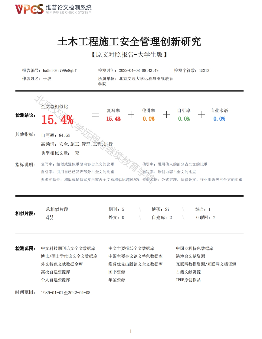 维普论文检测系统VIP PAPER CHECK SYSTEM土木工程施工安全管理创新研究【原文对照报告-大学生版】报告编号:ba5cb03d799e8gbf检测时间:2022-04-0808:43:49检测字符数:15213作者姓名:于波所属单位:北京交通大学远程与继续教育学院全文总相似比复写率他引率自引率专业术语检测结论:15.4%15.4%0.0%0.0%0.0%其他指标:自写率:84.6%高频词:安全,施工,管理,工程,进行典型相似文章:无2指标说明:复写率:相似或疑似重复内容占全文的比重他引率:引用他人的部分占全文的比重自引率:引用自己已发表部分占全文的比重自写率:原创内容占全文的比重典型相似性:相似或疑似重复内容占全文总相似比超过0%专业术语:公式定理、法律条文、行业用语等占全文的比重总相似片段期刊:5博硕:27综合:1相似片段:42外文:0自建库:2互联网:7检测范围:中文科技期刊论文全文数据库中文主要报纸全文数据库中国专利特色数据库博士/硕士学位论文全文数据库中国主要会议论文特色数据库港澳台文献资源外文特色文献数据全库维普优先出版论文全文数据库互联网数据资源/互联网文档资源高校自建资源库图书资源古籍文献资源个人自建资源库年鉴资源IPUB原创作品时间范围:1989-01-01至2022-04-08维普论文检测系统VIP PAPER CHECK SYSTEM原文对照颜色标注说明:■自写片段■复写片段(相似或疑似重复)口引用片段(引用)■专业术语(公式定理、法律条文、行业用语等)毕业设计(论文)中文题目:土木工程施工安全管理创新研究学习中心(站点):西宁学习中心心续教育学院专业:土木工程姓名:于波学号:20655884指导教师:王洋北京交通大学远程与继续教育学院2022年4月中文摘要土木工程是国家建设和企业发展的重要内容,三者之间存在必要的内在联系,因此土木工程施工的安全保障至关重要,不仅关系到社会的稳定,也与施工者的生命相连接。确保施工安全,是施工方必须全面考虑和计划的问题,从选材、施工规范、施工步骤和顺序等方面展开。只有施工安全得到充分的保障,才能避免事故发生,确保工程在有限期内完成,为提高施工效率奠定基础。同时,考虑到工程施工本身的风险属性,对工程施工的管理要求需要更加严格。鉴于此,本文在土木工程安全管理相关理论概述的基础之上,以X桥为例,对土木工程安全管理创新方面的内容展开论述。关键词:土木工程:施工安全:管理创新ABSTRACTCivil engineering is an important part of national construction and enterprise development,andthere is a necessary internal relationship among them,so the safety of civil engineeringconstruction is very important,not only related to social stability,but also connected with thelives of the builders.Ensuring construction safety is a problem that must be comprehensivelyconsidered and planned by the construction side,which is carried out from the aspects of materialselection,construction code,construction steps and sequence,etc.Only when the constructionsafety is fully guaranteed can accidents be avoided,the project can be completed within a limited2维普论文检测系统VIP PAPER CHECK SYSTEMperiod of time,and the foundation for improving construction efficiency can be laid.At the sametime,considering the risk attribute of the pro ject construction itself,the management requirementsof the project construction are more strict.In view of this,on the basis of summarizing therelevant theories of civil engineering safety management,and taking X Bridge as an example,thispaper discusses the innovation of civil engineering safety management.KEYWORDS:civil engineering;Construction safety;Management innovation引言近年来,我国发展的进程不断加快,城市化建设逐步推进,城市中公路、楼房等大型设施建设逐渐增多,施工现场分布在城市各个地方。在我国的管理机制中,对于建筑施工有相应的管理办法,但长期以来,由施工造成的财产损失、人员伤亡等问题依旧高发不断,没有得到很好地控制,这对国家财政、企业稳定、社会和谐都造成了不同程度的影响,长此以往,土木工程行业整体也会受到巨大冲击,阻碍其发展和进步。因此,在土木工程行业安全成为社会关注焦点之际,加强对其安全管理的研究和探索,在社会高速发展的背景下,找到适合该行业的安全管理办法,从而提高安全保障,降低行业事故发生率。1理论概述1.1土木工程施工安全管理概述土木工程施工企业往往具有保障项目安全施工的职责,实施管理办法是其职能的进一步细化,在整个工程的施工过程中,都要进行逐步的落实。将安全管理目标分为人员、设施、产品三个部分,通过采用不同的管理策略,分步对目标进行解读,按照计划投入人、财、物,从根本上保障施工的安全生产。1.2土木工程施工安全管理的特点父(1)流动性。土木工程安全管理面临施工队伍流动性强和施工人员不断转换的问题。首先一个项目的施工由不同的多个部分组成,而不同部分所需完成的任务需要不同的施工队伍来实现,因此,完成一个工程,需要多个施工队伍之间进行流转,就这一点而言,提高了队伍整体管理的难度。另外施工队伍中的人员大多由带领者召集组成,并且非专业科班出身,人员之间的频繁流动,加剧了队伍组成的临时性质,也加大了人员管理和培训的难度。综合以上两点,要进一步保障施工的安全,需要解决施工队伍以及对应人员的流行性问题。(2)密集性。现如今,工程的施工现状往往是范围有限,场所狭小,现代化程度不高,这也意味着工程中的大多作业依旧需要人力来完成,而不同施工部