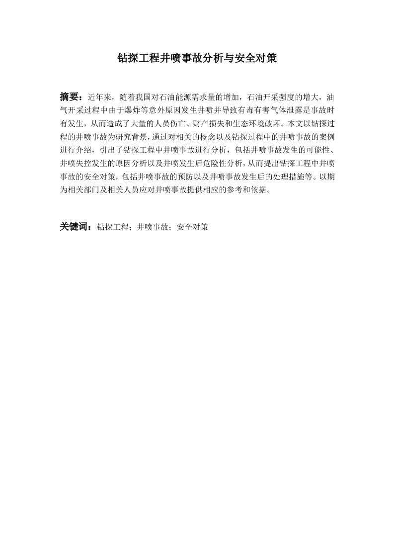钻探工程井喷事故分析与安全对策摘要:近年来,随着我国对石油能源需求量的增加,石油开采强度的增大,油气开采过程中由于爆炸等意外原因发生井喷并导致有毒有害气体泄露是事故时有发生,从而造成了大量的人员伤亡、财产损失和生态环境破坏。本文以钻探过程的井喷事故为研究背景,通过对相关的概念以及钻探过程中的井喷事故的案例进行介绍,引出了钻探工程中井喷事故进行分析,包括井喷事故发生的可能性、井喷失控发生的原因分析以及井喷发生后危险性分析,从而提出钻探工程中井喷事故的安全对策,包括井喷事故的预防以及井喷事故发生后的处理措施等。以期为相关部门及相关人员应对井喷事故提供相应的参考和依据。关键词:钻探工程;井喷事故;安全对策目录前言一、相关概念(一)钻探工程(二)井喷事故3二、钻探工程井喷事故具体案例,4三、钻探工程井喷事故分析(一)井喷发生的可能性分析…5(二)井喷失控发生的原因分析6(三)井喷发生后危险性分析6四、钻探工程中井喷事故的安全对策8(一)井喷事故的预防.…8(二)井喷事故发生后的处理措施参考文献…前言:钻探过程中井喷事故的发生是较为频繁的,井喷事故发生后,人员的伤亡以及财产的损失率居高不下,严重威胁着钻井工人和附近工作人员乃至人民群众的生命财产安全。不仅对社会的安定造成极大的消极影响,同时,也对我国的油田企业造成巨大的损失,一定程度上削弱了国家油田工业在世界钻井市场上的竞争力,阻碍了我国油田工业的继续发展。此外,井喷的发生,还会造成的环境的严重污染,产生生态破坏和能源浪费,不利于我国可持续发展挂念的事实。由此可见,井喷事故所造成的直接或间接损失都是巨大的,是难以用数字来衡量的。因此,找出钻探过程中井喷现象产生的原因,并提出相应的解决对策,已经迫在眉睫。一、相关概念(一)钻探工程钻探工程是指通过使用一定的工具,在地壳内按着一定的工艺破碎岩石的整个过程,这项工程的结果即地壳内的钻孔,钻探工程是获得地下蕴藏的真实地质资料和直接信息的一种技术。通过钻探可对所取得的地质和矿产资源参数作出最终可靠的评价。山钻探工程有着广泛的应用领域,一般涉及到需要在岩土体里形成柱状圆孔或槽,或采取岩心或土样以获得地层有关信息的工程均可采用钻探工程。钻探工程主要的应用领或包括水文地质勘查、工程地质勘查、地质找矿勘探、建筑深基础建造、开采低下资源、地基防渗加固处理、工业污水处理及防止城市地面、沉降、矿山开采等。(二)井喷事故井喷是钻井过程中地层流体(石油、天然气、水等)的压力大于井内压力而大量涌入井筒,并从井口无控制地喷出的现象。四而井喷事故则是由喷发时巨大的压力和冲击波所造成的人员伤亡和财产损失。发生井喷的原因是对钻开的地层压力情况不清或预计不准,使用的钻井液密度不足以平衡地层压力,导致地层流体大量涌入井简,再加上地面控制系统失灵无法有效控制。井喷事故是一种十分有害的钻井事故,一旦出现往往产生严重后果,必须采取严密的预防措施。可胡远彪,钻探工程计算机辅助设计系统的研究与开发,中国地质大学博士学位论文,2006年5月。冈吴志均、陈刚等,天然气钻井井控技术的发展,石油钻采工艺,2010年第5期。