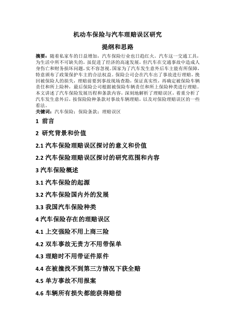 机动车保险与汽车理赔误区研究提纲和思路摘要:随着私家车的日益增加,汽车保险行业也日趋红火。汽车这一交通工具,为生活中所不可缺失的,虽促进了经济的高速发展,但汽车在交通事故中造成人身伤亡和财务损坏问题,实不容忽视。国家为了汽车发生意外后车主能有所保障,特意颁布了政策保护车主的合法权益。保险公司会在汽车出了事故进行理赔,挽回被保险人的损失,理赔前要到事故现场查勘,保证真实性,再确定被保险车辆责任和所上险种,最后保险公司根据被保险车辆责任和所上保险种类进行理赔。本文讲述了汽车保险发展历程和条款内容,深刻地解析了理赔误区,着重分析了汽车发生意外后,按保险险种条款对事故车辆理赔,以及对保险理赔误区的一些看法。关键词:汽车保险:保险条款;理赔误区1前言2研究背景和价值2.1汽车保险理赔误区探讨的意义和价值2.2汽车保险理赔误区探讨的研究范围和内容3汽车保险概述3.1汽车保险的起源3.2汽车保险国内外的发展3.3我国汽车保险种类4汽车保险存在的理赔误区4.1上交强险不用上商三险4.2双车事故无责方不用带保单4.3理赔时不用带证件原件4.4在被撞找不到第三方情况下获全赔4.5单方事故不用报案4.6车辆所有损失都能获得赔偿5机动车综合商业保险责任免除条款分析5.1各大保险险种的免赔条款分析5.2免赔率以及免赔额6结论参考文献致谢