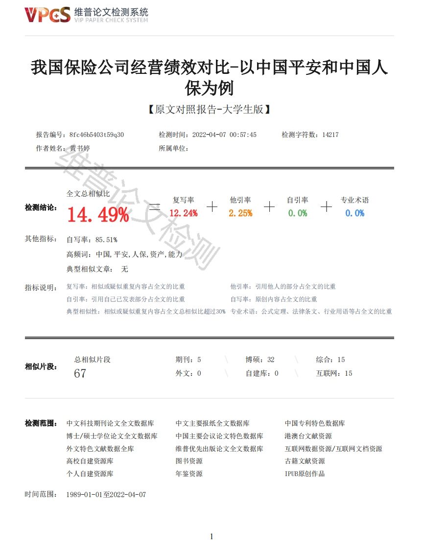 维普论文检测系统/IP PAPER CHECK SYSTEM我国保险公司经营绩效对比以中国平安和中国人保为例【原文对照报告-大学生版】报告编号:8fc46b5403t59q30检测时间:2022-04-0700:57:45检测字符数:14217作者姓名:黄书婷所属单位:全文总相似比复写率他引率自引率专业术语检测结论:14.49%12.24%2.25%0.0%十0.0%其他指标:自写率:85.51%高频词:中国,平安,人保,资产,能力典型相似文章:无指标说明:复写率:相似或疑似重复内容占全文的比重他引率:引用他人的部分占全文的比重自引率:引用自己已发表部分占全文的比重自写率:原创内容占全文的比重典型相似性:相似或疑似重复内容占全文总相似比超过0%专业术语:公式定理、法律条文、行业用语等占全文的比重总相似片段期刊:5博硕:32综合:15相似片段:67外文:0自建库:0互联网:15检测范围:中文科技期刊论文全文数据库中文主要报纸全文数据库中国专利特色数据库博士/硕士学位论文全文数据库中国主要会议论文特色数据库港澳台文献资源外文特色文献数据全库维普优先出版论文全文数据库互联网数据资源/互联网文档资源高校自建资源库图书资源古籍文献资源个人自建资源库年鉴资源IPUB原创作品时间范围:1989-01-01至2022-04-07维普论文检测系统VIP PAPER CHECK SYSTEM原文对照颜色标注说明:■自写片段■复写片段(相似或疑似重复)口引用片段(引用)■专业术语(公式定理、法律条文、行业用语等)我国保险公司经营绩效比较分析-一以中国人保和中国平安为例黄书婷海南经贸职业技术学院摘要:随着经济的发展和社会的进步,人们的保险意识逐渐加强,对保险业的发展起到了积极的推动作用。但由于2020年新冠疫情在全球范围内的迅速传播,使得全球经济的发展受到了很大的影响,很多公司因此被迫按下了暂停键。新冠疫情的出现,让更多人意识到保险的重要性,在一定程度上增加了对保险的需求,这对保险行业来说是机遇也是挑战。在当前这种市场环境下,如何抓住机遇和迎接挑战,是每个保险公司应该思考的问题。中国平安和中国人保是保险行业比较具有代表性的保险公司,通过对他们财务指标的分析对比并给出客观合理的评价,可以给其他保险公司的经营管理带来一定的借鉴作用。本文主要通过阅读两家公司从2017年到2021年的年度报告,收集并整理相关数据后,对两家企业的营运能力、偿债能力、盈利能力和成长能力财务指标进行对比分析并合理评价两家公司的经营绩效。经过对比分析发现两家公司的财务状况不错,中国人保的偿债能力好于中国平安,经营较稳健,而中国平安的营运能力以及盈利能力会略胜中国人保一筹。关键词:中国人保:中国平安:经营绩效Comparative Analysis of Operating Performance of Insurance companies in China -A Case study ofPICC and Ping AnHuang ShutingHainan Vocational And Technical College of Economy and TradeAbstract:With the development of economy and social progress,people's insurance consciousnessis gradually strengthened,which plays a positive role in promoting the development of insuranceindustry.However,due to the rapid spread of COVID-19 worldwide in 2020,the development of theglobal economy was greatly affected,and many companies were forced to press the pause button.Theemergence of COVID-19 has made more people realize the importance of insurance and increased thedemand for insurance to some extent,which is both an opportunity and a challenge for the insuranceindustry.Under the current market environment,how to seize the opportunity and meet the challengeis the problem that every insurance company should think about.Ping An of China and PICC arerepresentative insurance companies in the insurance industry.Through the analysis and comparison oftheir financial indicators and the objective and reasonable evaluation,it can bring certainreference to the management of other insurance companies.By reading the annual reports of the twocompanies from 2017 to 2021 and collecting and sorting out relevant data,this paper makes acomparative analysis of the financial indicators of the operating capacity,debt paying capacity,profitability and growth capacity of the two companies and reasonably evaluates the operating2维普论文检测系统VIP PAPER CHECK SYSTEMperformance of the two companies.Through comparative analysis,it is found that the financialstatus of the two companies is good.Picc's debt paying ability is better than Ping An's and itsoperation is more stable,while Ping An's operation capacity and profitability are slightly betterthan PICC's.Key words:PICC;China peace;Business performance引言保险业在国家和社会经济发展中发挥着至关重要的作用,保险保障人民的生计、养老以及疾病等风险问题。保险业的发展状况影响着我国实现和谐社会、建设美好社会和维护社会稳定的长期战略目标。2020年新冠疫情的出现给保险业带来了机遇和挑战,面对当前的市场环境,各保险公司应适当调整经营管理方式和经营管理策略。经营绩效是反映公司经营状况的一种体现,良好的经营绩效可以很大程度的提升公司竞争力。保险公司经营绩效评价包含盈利能力、偿债能力、营运能力和成长能力四个方面[]。中国人保和中国平安是我国保险行业比较具有代表性的保险公司,通过对两家公司经营绩效的分析对比反映出其各自的经营状况,可以给其他保险公司的经营管理带来一定的借鉴作用。让保险业朝着更好的方向发展,对完善我国社会保障体系、推动国家全面建设小康社会具有重大的现实意义。一、保险公司经营绩效概述(一)经营绩效企业经营