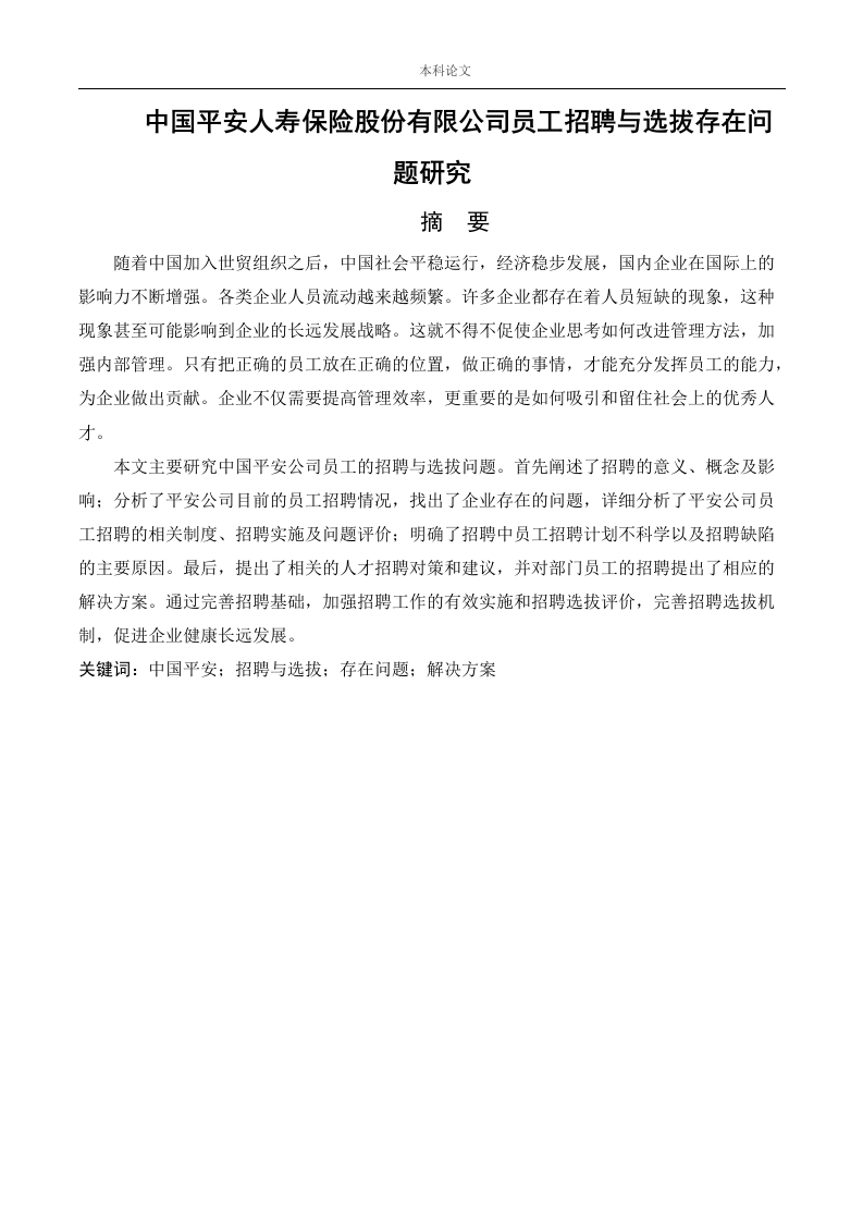 本科论文中国平安人寿保险股份有限公司员工招聘与选拔存在问题研究摘要随着中国加入世贸组织之后,中国社会平稳运行,经济稳步发展,国内企业在国际上的影响力不断增强。各类企业人员流动越来越频繁。许多企业都存在着人员短缺的现象,这种现象甚至可能影响到企业的长远发展战略。这就不得不促使企业思考如何改进管理方法,加强内部管理。只有把正确的员工放在正确的位置,做正确的事情,才能充分发挥员工的能力,为企业做出贡献。企业不仅需要提高管理效率,更重要的是如何吸引和留住社会上的优秀人才。本文主要研究中国平安公司员工的招聘与选拔问题。首先阐述了招聘的意义、概念及影响:分析了平安公司目前的员工招聘情况,找出了企业存在的问题,详细分析了平安公司员工招聘的相关制度、招聘实施及问题评价:明确了招聘中员工招聘计划不科学以及招聘缺陷的主要原因。最后,提出了相关的人才招聘对策和建议,并对部门员工的招聘提出了相应的解决方案。通过完善招聘基础,加强招聘工作的有效实施和招聘选拔评价,完善招聘选拔机制,促进企业健康长远发展。关键词:中国平安:招聘与选拔:存在问题:解决方案本科论文目录1.1研究背景..1.3研究意义332.3科学的招聘与选拔对企业的影响..2.3.1填补岗位空缺,增强企业活力.·2.3.2.吸引人才,争强企业竞争力...42.3.3.降低成本,提高员工效率....42.3.4.改善企业形象,增强企业影响力2.3.5.减少管理者与员工矛盾与冲突...43.1中国平安保险(集团)股份有限公司简介..第四章企业招聘与选拔过程中存在的问题.·4.2平安集团员工招聘工作无秩序,缺少科学有效的实施流程..94.3平安集团员工招聘需求定位、招聘标准指标不明确4.4中国平安员工招聘忽视企业文化、企业形象的市场宣传....10115.2平安集团要建立科学的招聘体系、构建规范的招聘流程..115.3平安集团要明确招聘人才需求.....本科论文5.4平安集团要注重社会形象、企业文化的建立…125.6平安集团要时刻监督培训效果,并对培训结果进行反馈..13参考文献…16