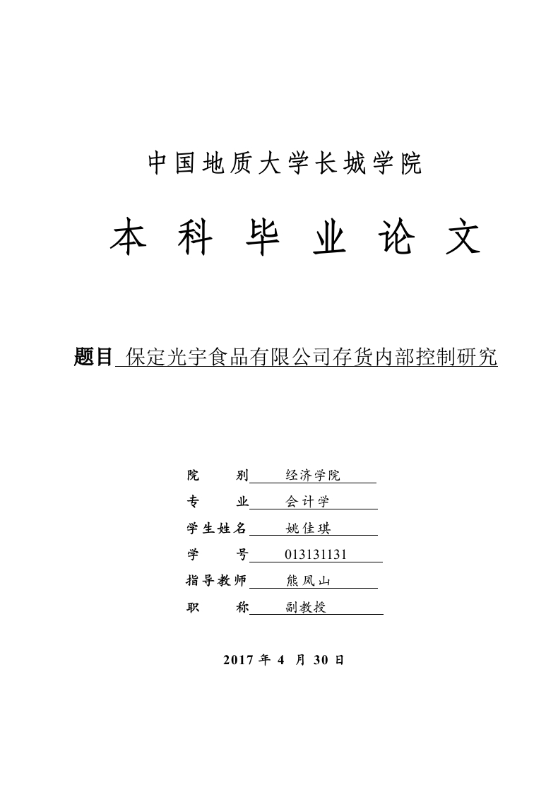 中国地质大学长城学院本科毕业论文题目保定光宇食品有限公司存货内部控制研究院别经济学院专业会计学学生姓名学号013131131指导教师熊凤山职称副教授2017年4月30日本科毕业生毕业论文(设计)诚信承诺书毕业论文保定光宇食品有限公司存货的内部控制研究(设计)题目学生姓名姚佳琪专业会计学号013131131指导老师熊凤山职称副教授所在系别经济学院诚信承诺本人慎重承诺和声明:我承诺在毕业论文(设计)活动中遵守学校有关规定,恪守学术规范,在本人的毕业论文中不剽窃、抄袭他人的学术观点、思想和成果,不篡改研究数据,如有违规行为发生,我愿承担一切责任,接受学校的处理。学生(签名):年月日中国地质大学长城学院毕业论文任务书学生姓名姚佳琪号013131131专业班级会计学十一班指导教师熊凤山职称副教授单位河北农业大学毕业论文题目保定光宇食品有限公司存货的内部控制研究毕业论文主要内容和要求:主要内容:存货在资产占用比重过大一直是中小企业管理工作中一项十分重大的问题,为了保证存货的安全完整,提高存货运营效率,防止存货业务中的各种差错,及时发现并纠正存货业务中的各种问题,加强企业成本控制,实施低成本战略,促进企业生产经营持续稳步发展,对存货进行科学合理的内部控制显得尤为重要。从而为保定光宇食品有限公司提高经济效益、优化资源配置,实现企业战略目标进行一系列的探索。要求:论文撰写要求思路清晰、内容充实、论点明确,论据充分,论证严密,语言通顺。撰写论文前应首先阅读相关的研究资料,掌握学术前沿动态,对相关理论著作要很好的把握,提高理论水平及思想深度。根据开题报告和老师提出的意见对论文提纲进行修改,确定大纲后认真撰写毕业论文。撰写论文结束后要根据老师的修改意见,认真反复的修改论文,并按照要求参加毕业论文的答辩,严格按照论文进度安排进行论文的写作。论文的格式、字数等撰写方面的要求参照《中国地质大学长城学院毕业论文(设计)撰写规范》。毕业论文主要参考资料:[1]孙文美浅论企业存货过程中的内部控制与风险管理).中国总会计师,2011,(1):1-9.[2]郜帆论企业存货内部控制.机械管理开发,2013,(2):11-16.[3)]王鸿丽.存货的内部控制)治金财会,2014,29-42.[4唐雪清.浅谈企业的存货管理存在问题、原因以及解决办法).当代经济,2010,56-59.[5)]洪洁.浅淡解决企业存货内部控制存在问题的措施).职业技术,2012,156-178.[6王敏.完善企业存货内部控制的对策探讨.会计师,2011,(7):256-280.胡晓松.浅论存货管理存在问题及对策.西部财会,2014,(12):,12-17.[8]吴稳珠.试论企业存货的内部控制).商业文化(学术版),2012,19-30.[9林晓月.我国企业存货内部控制探析).会计师,2012,39-42.[10]王爱芳.企业存货的内部控制).治金财会,2011,69-82.[11】王芳.中小企业存货内部控制诊断及改进策略凹.商业会计,2011,98-106.[12]李彦.企业内部控制规范实施中存在的问题及改进思路).会计之友,2013,(26):26-39.[13]王锋华.企业存货内部控制研究D].华中科技大学,2013,2544.[14李贺.我国中小企业存货管理的改进.消费导刊,2012,(4):4-8.[15]Donaid Waters.Inventory Control and Management[M].2nd edition.John Wiley Sons,2012.