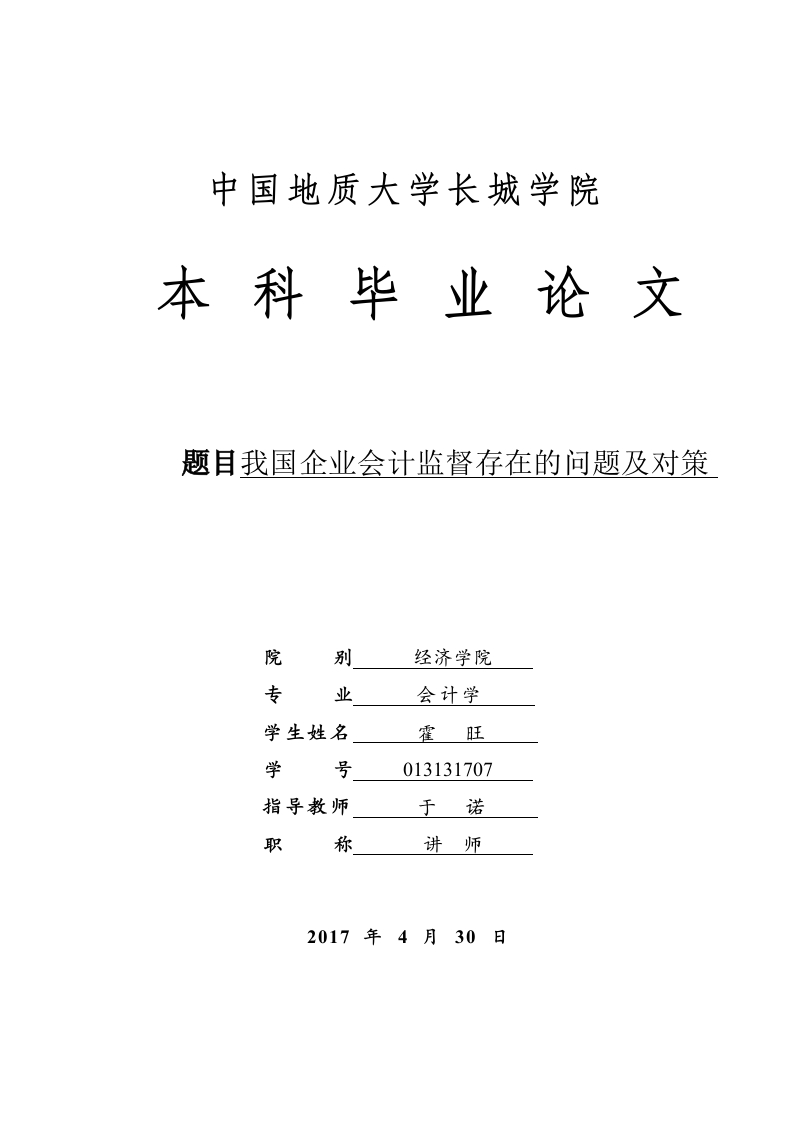 中国地质大学长城学院本科毕业论文题目我国企业会计监督存在的问题及对策院别经济学院专业会计学学生姓名霍旺学号013131707指导教师于诺职称讲师2017年4月30日我国企业会计监督存在的问题及对策摘要由于经济改革的逐渐发展,企业的账务改革同时获得了很好的成效,在改革的推动下,企业的会计制度也相应的提高了,会计监督也变得越来越重要,会计监督职能发挥的作用不仅仅可以使经济秩序变得良好,而且还会对于会计行业的基本行为准则变得更加规范,所以说会计管理秩序的建立是非常必要的。目前我国的企业内部监督存在着许多不足得地方,会计信息失真的问题导致会计工作的混乱,有许多的漏洞,但是由于监管不力造成经济违法,严重的导致犯罪的发生,大大的的影响了企业经营和发展,所以,只有当我们发现了企业会计监督的问题所在,把流程合理改善,加大程序的监管,同时保证公司资产的安全,合理的规避风险,才能使企业的良好发展得以保障。关键词:企业会计监督:信息失真;监管力度ABSTRACTDue to the gradual development of economic reform,enterprise's accounting reformobtained very good results at the same time,under the impetus of the reform,the enterpriseaccounting system and the corresponding improved and the function of accounting supervision isbecoming more and more attention to the role of accounting supervision function not only canmaintain the normal economic order,the establishment of the accounting management orderwith big role.At present our country enterprise internal supervision,there are manydisadvantages,accounting information distortion problem has led to chaos in the accountingwork,there are a lot of loopholes,due to little regulation of the economic law,and even lead tothe occurrence of crime,seriously affected the enterprise operation and development,so,onlyfound that the problem of enterprise accounting supervision,reasonable process improvementbusiness enterprise supervision,and oversight of program,at the same time to ensure the safetyof the company's assets,reasonable avoid risk,to make to protect the sound development of theenterprise.Key words:Enterprise accounting supervision;Information distortion;Regulation目录2企业会计监督的相关理论.12.1企业会计监督的内涵.22.2企业会计监督的作用…2.3企业会计监督的重要性.3当前会计监督中存在的问题.…23.1企业内部监督机制不完善.23.2法律体系不健全,无法提供法律保障3.3社会监督不完善,会计主体不明确…43.4信息质量问题严重,虚假行为普遍…43.5企业负责人意识的薄弱..44现代企业制度建立中的会计监督的改善建议…54.1完善企业自身会计监督制度.…4.2加强法律监管力度,严厉惩罚违法乱纪行为.54.3依法履行职责,合理规范监督工作.…64.4加强基础工作建设,提高职业素养.…64.5企业负责人要加强责任意识75结论致谢9
