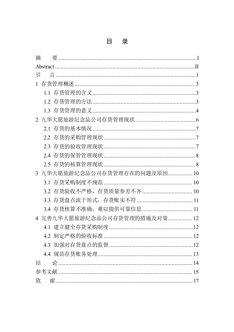 目录摘要Abstract.…1存货管理概述31.1存货管理的含义.1.2存货管理的方法1.3存货管理的意义42九华大愿旅游纪念品公司存货管理现状62.】存货的基本情况72.2存货的采购管理现状2.3存货的验收管理现状72.4存货的保管管理现状82.5存货的核算管理现状,83九华大愿旅游纪念品公司存货管理存在的问题及原因.…103.1存货采购制度不规范.…103.2存货验收不严格,存货质量参差不齐103.3存货盘点流于形式,存货账实不符113.4存货核算不准确,难以提供可靠信息114完善九华大愿旅游纪念品公司存货管理的措施及对策124.1建立健全存货采购制度…124.2制定严格的验收标准124.3加强对存货盘点的监督.124.4规范存货账务处理13结论参考文献15致沈阳城市学院毕业设计〔论文)摘要企业存货管理制度作为企业中一项非常重要的制度,对于企业各项业务的健康发展具有连续作用,其本身特点流动性较弱、金额占总资产比较大,其周转速度的快慢直接关系到企业流动资金的使用效率,是一个公司是否可以持续健康发展的重要因素。本文以九华大愿旅游纪念品公司的为例,先介绍了存货管理的含义、方法和意义,在分析九华大愿旅游纪念品公司存货管理现状的基础上,指出九华大愿旅游纪念品公司存货管理存在的问题:内部采购制度不完善,存货积压严重:存货盘点流于形式,存货账实不符:存货核算不准确,难以提供可靠信息等问题。最后存在的问题提出相应的对策建议,主要包括规范存货的采购制度,加强市场预测:制定严格的验收标准,加强对存货盘点的监督,规范存货账务处理因此,应提高存货管理的科学性,实施严格的内部控制,进行科学决策,通过对存货进行有效控制来提高企业效益和竞争力、降低企业经营成本。关键词:存货管理:存货采购:存货验收:存货盘点;存货核算沈阳城市学院毕业设计(论文)AbstractAs the assets with weak relative liquidity and large amount in totalassets,the turnover speed of enterprise inventory is directly related to theoperation efficiency of enterprise liquidity.Is an important factor for acompany's sustainable and healthy developmentThis paper expounds the warehouse management of Jiuhua Dayuansouvenir company in four parts:the first part:Inventory managementoverview,Part II:inventory management status of Jiuhua Dayuan touristsouvenir company,Part III:Problems and causes of inventorymanagement of Jiuhua Dayuan tourist souvenir company,Part IV:measures and Countermeasures to improve the inventory management ofJiuhua Dayuan tourist souvenir company,elaborating in detail theunreasonable internal procurement plan,serious inventory backlog,inventory disk It is difficult to provide reliable information and otherproblems.Finally,it puts forward corresponding countermeasures andsuggestions,mainly including improving the purchase plan of inventory,strengthening the market forecast,formulating strict acceptance standards,strengthening the supervision of inventory counting,and standardizingthe inventory accounting treatment.Therefore,it is necessary to improvethe scientificity and reality of inventory management Strict internalcontrol,scientific decision-making,effective inventory control toimprove the efficiency and competitiveness of enterprises,reducebusiness costs.Keywords:inventory management;inventory purchase;inventoryacceptance;inventory counting;inventory accounting