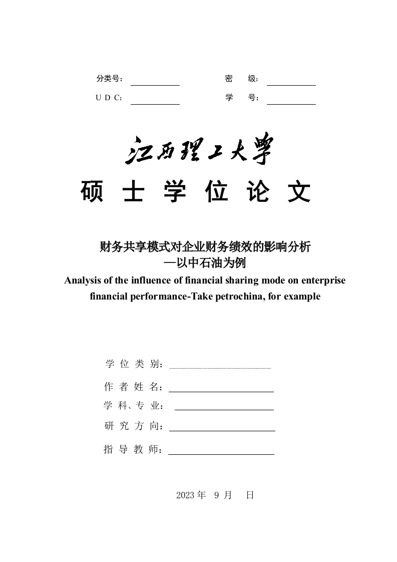 分类号:密UD C:学号硕士学位论文财务共享模式对企业财务绩效的影响分析一以中石油为例Analysis of the influence of financial sharing mode on enterprisefinancial performance-Take petrochina,for example学位类别:作者姓名:学科、专业:研究方向:指导教师:2023年9月日学位论文独创性声明本人声明所呈交的论文是本人在导师指导下进行的研究工作及取得的研究成果。据我所知,除了文中特别加以标注和致谢的地方外,论文中不包含其他人已经发表或撰写过的研究成果,也不包含已获得江西理工大学或其他教育机构的学位或证书而使用过的材料。与我一同工作的同志对本研究所做的任何贡献均已在论文中做了明确的说明并表示谢意。申请学位论文与资料若有不实之处,本人承担一切相关责任。研究生签名:时间:年月日学位论文版权使用授权书本人完全了解江西理工大学关于收集、保存、使用学位论文的规定:即学校有权保存按要求提交的学位论文印刷本和电子版本,学校有权将学位论文的全部或者部分内容编入有关数据库进行检索,并采用影印、缩印或扫描等复制手段保存、汇编以供查阅和借阅:学校有权按有关规定向国家有关部门或者机构送交论文的复印件和电子版。本人允许本学位论文被查阅和借阅,同意学校向国家有关部门或机构送交论文的复印件和电子版,并通过网络向社会公众提供信息服务。保密的学位论文在解密后适用本授权书学位论文作者签名(手写):导师签名(手写):签字日期:年月日签字日期:年月日摘要摘要近年来,随着信息技术和互联网的不断发展,我国企业的财务业务范围越来越广,进而企业所面对的数据量和复杂度越来越大,财务风险也随之增加,这也使得企业对财务管理的要求越来越高。而传统的财务管理模式存在数据处理速度慢、风险控制能力弱等问题,已不能适应现代企业发展的需要。因此,企业迫切需要改革内部财务管理方式,而财务共享模式作为一种创新的财务管理手段,能够在集中处理和优化财务流程、降低成本、提升数据处理速度等方面发挥重要作用,于是财务共享模式逐渐成为大多数企业的选择:石油是我国重要的基础能源,也是我国国民经济的重要支柱,对各行业的发展起基础性支撑性作用,整个石油产业涉及上下游的关键环节较多,所以其财务部门对于财务共享的需求相对较迫切,于是很早就采用了财务共享这种模式,相对较为成熟。在行业内,中石油是属于龙头企业,各项业务及财务流程较为规范,财务共享模式使用相对较成熟,具有一定代表性。基于此,本文以中石油企业为例,结合该企业实施财务共享模式前后企业财务绩效变化状况,明晰企业财务模式共享对企业财务绩效影响内在机理,探究中石油实施财务共享服务对企业财务绩效的影响路径,具有一定的理论与现实意义。本文以中石油企业为例,主要运用了财务指标分析法和因子分析法,从偿债能力、经营能力、盈利能力、发展能力等方面对中石油企业财务绩效进行研究分析,通过分析该企业实施财务共享模式前后企业财务绩效变化状况,进而探究企业财务模式共享对企业财务绩效影响内在机理:研究发现中石油企业在实施财务共享服务后的财务指标数据明显优于实施财务共享服务前,具体体现在它能够提高企业的营业利润率、销售净利率、总资产收益率、应收账款周转率、资产负债率、现金比率等财务指标。基于上述分析,本文进一步对财务共享模式影响企业财务绩效的具体影响路径进行了详细分析,主要包括:(1)财务共享模式下企业偿债能力提升路径(2)财务共享模式下企业经营能力提升路径(3)财务共享模式下企业盈利能力提升路径:最后,本文从偿债能力、经营能力、盈利能力、发展能力等方面提出提升中石油企业财务绩效的建议,主要包括:(1)优化资本结构,降低融资成本(2)加强内部资金管理,提高资产负债率(3)强化风险控制(4)优化资源配置,提高资产周转率(5)深化内部改革,提高管理效率等。通过本文研究,以期为中石油企业以及其他同类型企业实践财务共享模式提供一定的参考实践意义。关键词:财务共享:财务分析:财务绩效