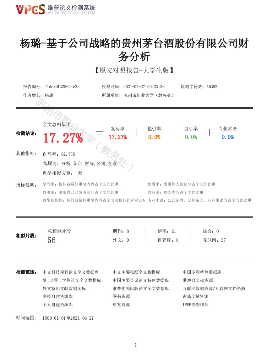 维普论文检测系统VIP PAPER CHECK SYSTEM杨璐-基于公司战略的贵州茅台酒股份有限公司财务分析【原文对照报告-大学生版】报告编号:41de8d13286b4c2d检测时间:2021-04-2700:23:36检测字符数:15392作者姓名:杨璐所属单位:苏州市职业大学(教务处)全文总相似比/复写率他引率自引率专业术语检测结论:17.27%17.27%0.0%0.0%0.0%其他指标:自写率:82.73%高频词:分析,茅台,财务,公司,企业典型相似文章:无指标说明:复写率:相似或疑似重复内容占全文的比重他引率:引用他人的部分占全文的比重自引率:引用自己已发表部分占全文的比重自写率:原创内容占全文的比重典型相似性:相似或疑似重复内容占全文总相似比超过30%专业术语:公式定理、法律条文、行业用语等占全文的比重总相似片段期刊:8博硕:21综合:0相似片段:56外文:0自建库:0互联网:27检测范围:中文科技期刊论文全文数据库中文主要报纸全文数据库中国专利特色数据库博士/硕士学位论文全文数据库中国主要会议论文特色数据库港澳台文献资源外文特色文献数据全库维普优先出版论文全文数据库互联网数据资源/互联网文档资源高校自建资源库图书资源古籍文献资源个人自建资源库年鉴资源IPUB原创作品时间范围:1989-01-01至2021-04-27维普论文检测系统VIP PAPER CHECK SYSTEM原文对照颜色标注说明:■自写片段■复写片段(相似或疑似重复)引用片段(引用)■专业术语(公式定理、法律条文、行业用语等)XING ZHI COLLEGE OF XI'AN UNIVERSITY OF FINANCE AND ECONOMICS毕业论文(设计)论文题目:基于公司战略的贵州茅台酒股份有限公司财务分析学生姓名:杨璐学号:1704030262专业:会计学班级:会计1708指导教师:张星娟完成日期:2021年月日基于公司战略的贵州茅台酒股份有限公司财务分析摘要在当今市场环境下,企业必须解决来源于外部和内部的各种问题。企业需分析自身的经营信息。特别是财务方面,然后把制定长期战略计划作为重要任务。因此,做好财务分析是公司的战略发展所不可或缺的。然而,传统的财务分析通常以公司财务信息为基础,侧重于公司内部的分析,忽略了公司战略、宏观环境等非金融方面的问题。因此,在公司战略视角下,财务分析不仅要研究企业的财务信息,而且还需要从公司战略和宏观环境中获取非金融信息,用来了解企业的整体状况。本文首先陈述了公司战略和财务分析的基本概念和理论,并以贵州茅台酒为例,对其企业战略和财务状况进行了分析,提出了有针对性的措施和策略,为贵州茅台酒战略的制定和实施提供指导和参考。关键词:公司战略财务分析宏观环境Financial analysis of Guizhou Maotai Liquor Co.,Ltd.based on company strategyContent summaryIn the environment of fierce competition,enterprises need to face the external and internalchallenges.They need to analyze the company's various information,especially financialinformation,and then start to develop long-term strategic planning.Therefore,financial analysisis essential for the strategic development of the company.The function of financial analysis is tounderstand the history of a company's financial situation and its operating performance.However,2维普论文检测系统VIP PAPER CHECK SYSTEMthe traditional financial analysis is generally based on the enterprise financial information,focusing on the analysis of the company's internal situation,thinking about the enterprisestrategy,macro environment and other non-financial issues is not comprehensive enough Therefore,the financial analysis based on the perspective of enterprise strategy should not only discuss thefinancial information of the enterprise,but also obtain the non-financial information from the twoaspects of enterprise strategy and macro environment,so as to grasp the position of the enterprisein the whole industry.This paper first expounds the basic concepts and theories of enterprisestrategy and financial analysis,and takes Guizhou Maotai liquor as an example to analyze itsenterprise strategy and financial situation,and puts forward targeted measures and strategies,soas to provide guidance and reference for the formulation and implementation of Guizhou Maotai liquorstrategy.Key words:company strategy financial analysis macroenvironment目录序言1相关概念1门(一)财务分析1(二)公司战略1(三)杜邦分析法2二、公司战略下贵州茅台股份有限公司的财务分析2(一)贵州茅台的战略分析21.宏观环境分析22.竞争分析3教务处)3.生命周期分析44.SW0T分析4(二)贵州茅台的财务分析51.财务报表分析52.财务指标分析73.杜邦体系综合分析94.财务分析在企业战略中的应用10三、公司战略下贵州茅台股份有限公司财务分析优化的对策建议10(一)推进问题治理10(二)加强梯队建设11(三)拓宽营销渠道11(四)加强知识产权保护11(五)加强人才培养11结论12参考文献13致谢14序言财务报表是企业提交的反映其财务状况的文件,但是,财务报表中的数字并不是企业目前的情况的真实反映,想要其转变为有用的、直观的报表信息,只能将这些数字比对探析后。企业在风云变幻的市场环境中,企业发展的需要不满足于传统的财务报表分析方法,因此,必须对财务报表的分析和阅读方法进行更新,才能获得关于企业的详细资料。有效的财务分析方法不仅需要掌握财务和非财务信息的使用方法,而且还需要战略眼光。由于该战略影响企业的经营方向和经营理念,而且还体现了企业对未来的发展目标所做出的相应调整。因此,战略分析是以财务报表分析为基础的。对于财务分析,不同学者从不同的角度进行了相关的研究。
