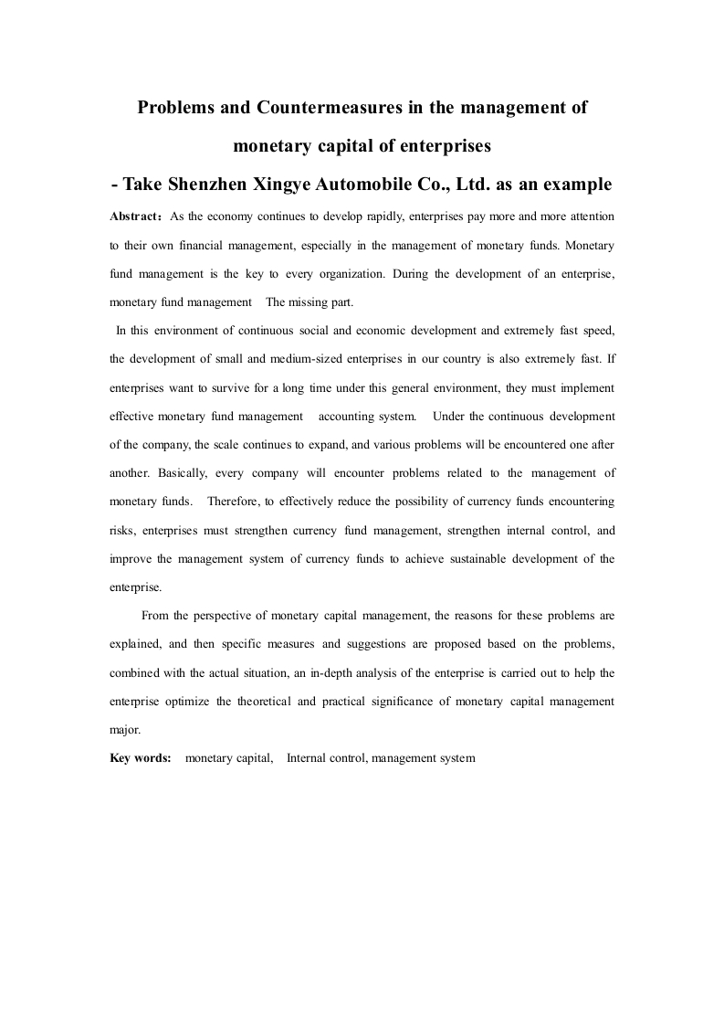 Problems and Countermeasures in the management ofmonetary capital of enterprisesTake Shenzhen Xingye Automobile Co.,Ltd.as an exampleAbstract:As the economy continues to develop rapidly,enterprises pay more and more attentionto their own financial management,especially in the management of monetary funds.Monetaryfund management is the key to every organization.During the development of an enterprise,monetary fund management The missing part.In this environment of continuous social and economic development and extremely fast speed,the development of small and medium-sized enterprises in our country is also extremely fast.Ifenterprises want to survive for a long time under this general environment,they must implementeffective monetary fund management accounting system.Under the continuous developmentof the company,the scale continues to expand,and various problems will be encountered one afteranother.Basically,every company will encounter problems related to the management ofmonetary funds.Therefore,to effectively reduce the possibility of currency funds encounteringrisks,enterprises must strengthen currency fund management,strengthen internal control,andimprove the management system of currency funds to achieve sustainable development of theenterprise.From the perspective of monetary capital management,the reasons for these problems areexplained,and then specific measures and suggestions are proposed based on the problems,combined with the actual situation,an in-depth analysis of the enterprise is carried out to help theenterprise optimize the theoretical and practical significance of monetary capital managementmajor.Key words:monetary capital,Internal control,management system目录第1章绪论…1.2国内外研究现状21.2.1国内研究现状21.2.2国外研究…1.3研究的内容与方法.31.3.1研究的内容.…1.3.2研究的方法.…第2章货币资金管理概述…42.1货币资金的概念及特点.42.1.1货币资金的概念…2.1.2货币资金的特点.….2.2企业货币资金管理的概念及特点52.2.1货币资金管理的概念.…2.2.2货币资金管理的特点…5第3章企业货币资金管理问题及原因分析.3.1企业货币资金管理处在的问题.73.2企业货币资金管理问题的解决办法83.21转变观念,提高对资金管理的认识.…83.2.2重视选拔人才,用好人,加强理论知识培训与学习.83.2.3加强货币资金内部控制与管理.93.2.4加强外部监管力度.…104.1深圳市兴业汽车有限公司简介114.2企业货币资金管理存在的问题.114.2.1资金使用效率不高.…4.2.2财务人员素质不高、职务没有明确的分离…124.2.3资金内部管理体制不够完普。134.2.4信息失真,传递不够及时.144.3完善兴业本田货币资金管理的措施..144.3.1提高货币资金的使用和管理效率144.3.2提高财务人员素质、实行不相容职务分离.154.3.3健全并完善货币资金管理体制..154.3.4提高信息传递…17第5章总结参考文献:.20