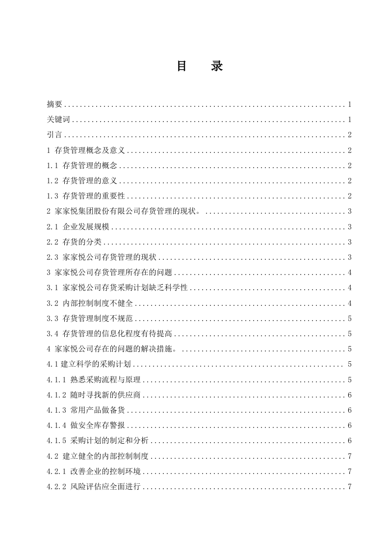 目录引言…1.1存货管理的概念..21.2存货管理的意义.…21.3存货管理的重要性.......22家家悦集团股份有限公司存货管理的现状。332.3家家悦公司存货管理的现状.....3家家悦公司存货管理所存在的问题..43.1家家悦公司存货采购计划缺乏科学性53.4存货管理的信息化程度有待提高...4家家悦公司存在的问题的解决措施。4.1建立科学的采购计划...54.1.1熟悉采购流程与原理....4.1.2随时寻找新的供应商......64.1.3常用产品做备货..64.1.4做安全库存警报....4.1.5采购计划的制定和分析....4.2建立健全的内部控制制度.4.2.1改善企业的控制环境....74.2.3要使企业的内部控制活动变好.·84.2.4要建立广范围的交流信息94.3完善家家悦公司的存货管理制度...104.4提高存货管理的信息化程度......5结论1111家家悦集团股份有限公司存货管理存在的问题及对策摘要:随着当今社会的发展,许多企业在不断扩大规模中,特别是以商品流通为主的企业,企业扩大随之而来的就是销量变多,存货也会增加,存货管理难免遇到的种种问题。本文从近几年的商业坏境以及经济情况,通过会计的角度,以家家悦集团股份有限公司为例,通过分析家家悦企业在存货管理这个方面存在的问题,提出与之相关的解决方法,以提升家家悦公司在存货管理的竞争能力,加速对该公司存货的管理,提升家家悦公司企业的核心竞争力关键词:存货管理:问题:对策Problems and Countermeasures of inventory management of Jia Jia YueGroup Limited by Share LtdAbstract:With the development of today's society,many enterprises are expanding their scale,especially theenterprises which mainly focus on commodity circulation.With the expansion of enterprises,there will bemore sales and more inventory,which will inevitably lead to various problems in inventory management.Fromthe perspective of accounting,taking jiajiayue Group Co.,Ltd.as an example,this paper analyzes the existingproblems in inventory management of Jiayue company,and puts forward relevant solutions to improve thecompetitiveness of Jiayue company in inventory management,accelerate the management of the company'sinventory,and avoid future price rise Adverse effect on the enterprise.Key words:Inventory management;problems;countermeasures