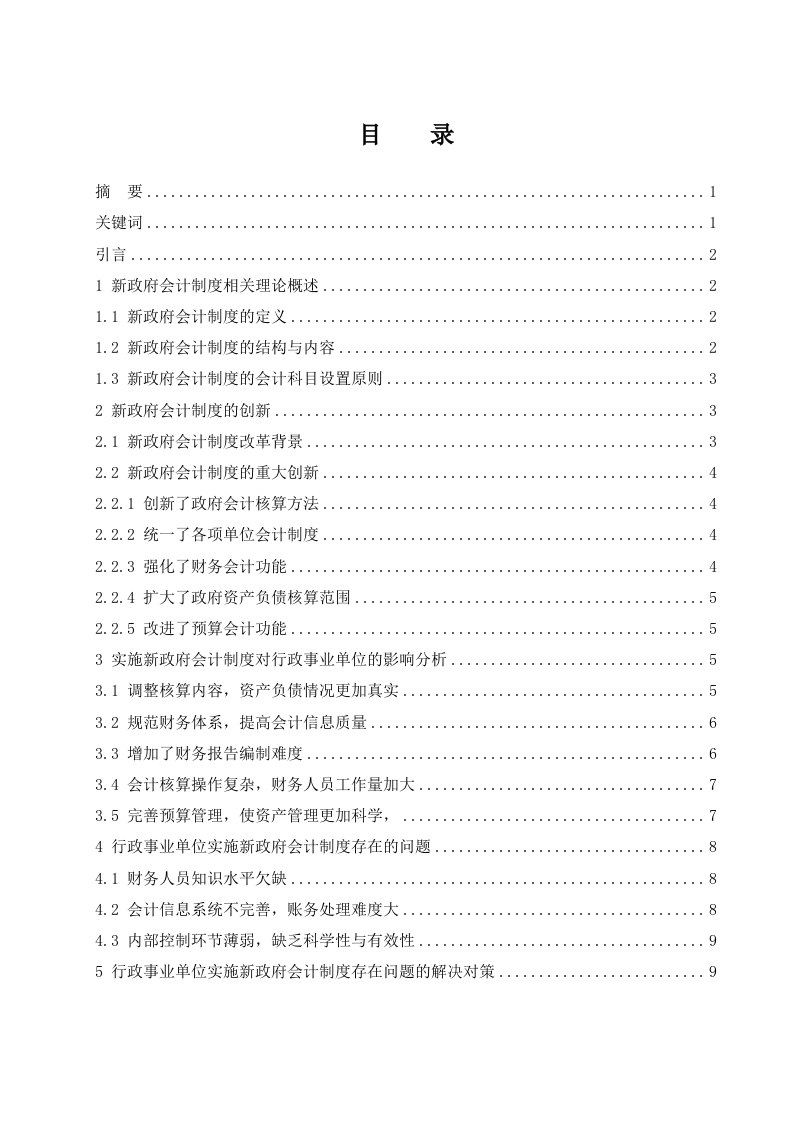 目录摘要21新政府会计制度相关理论概述21.2新政府会计制度的结构与内容.....1.3新政府会计制度的会计科目设置原则32新政府会计制度的创新..32.1新政府会计制度改革背景...32.2新政府会计制度的重大创新..·42.2.1创新了政府会计核算方法.·42.2.2统一了各项单位会计制度...2.2.4扩大了政府资产负债核算范围.…3实施新政府会计制度对行政事业单位的影响分析53.1调整核算内容,资产负债情况更加真实.·3.2规范财务体系,提高会计信息质量3.4会计核算操作复杂,财务人员工作量加大…73.5完善预算管理,使资产管理更加科学,74行政事业单位实施新政府会计制度存在的问题...84.1财务人员知识水平欠缺……4.2会计信息系统不完善,账务处理难度大....43内部控制环节薄弱,缺乏科学性与有效性....95行政事业单位实施新政府会计制度存在问题的解决对策..95.1提高财务人员业务水平.…5.2完善会计信息系统,做好新旧制度衔接工作6结论.11新政府会计制度对行政事业单位的影响研究摘要:目前,我国政府会计制度具有局限性,主要体现在政府资产负债的情况失真和阻碍政府绩效考核工作的开展,因此,需要建立一个新的政府会计制度。行政事业单位会计核算应当具备财务会计和预算会计双会计功能,实现财务会计与预算会计的适度分离并相互衔接。会计信息质量也随希新政府会计制度的出台得到提高。本文是通过新政府会计制度的执行对行政事业会计核算影响、内部控制影响和一些新的变化进行剖析,最后根据新政府会计制度对行政事业单位的影响提出相关的建议。关键词:新政府会计制度:行政事业单位:会计核算Research on the influence of new government accounting system onAdministrative InstitutionsAbstract:The new govemment accounting system is implemented on January 1,2019.In order to betterimplement the new govemment accounting system,we need to understand the connection between the newand old systems,do a good job of street connection and analyze the impact on administrative institutions.Theaccounting of administrative institutions should have the double accounting functions of financial accountingand budget accounting,realize the appropriate separation and connection of financial accounting budget andbudget accounting,and comprehensively and clearly reflect the financial information and budgetimplementation information of administrative institutions.This paper analyzes the impact of the newgovemment accounting system on administrative accounting,internal control and some new changes.Finally,according to the impact of the new goverment accounting system on administrative institutions,it putsforward the relevant constructionKeywords:New govemment accounting system:Administrative Institutions:Accounting1