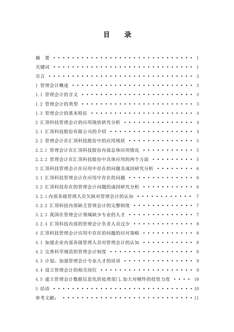 目录摘要关键词·······3331.3管理会计的基本特征・・・・42汇顶科技管理会计的应用现状研究分析····42.1汇顶科技股份有限公司的介绍・・・・・・・・・・・・・・・・・・42.2管理会计在汇顶科技股份中的应用现状····52.2.1管理会计在汇顶科技股份内部总体应用情况····53汇顶科技管理会计在应用中存在的问题及成因研究分析········663.2汇顶科技存在的管理会计问题的成因研究分析・・・・・・3.2.1内部各级管理人员欠缺对管理会计的认知···73.2.2汇顶科技内部缺乏管理会计的完整制度・・・・・3.2.3我国在管理会计领域缺少专业的人オ・・・・・・・・・・・・・・73.2.4汇顶科技内部的管理会计负责人员过少····4汇顶科技管理会计应用中存在的问题的应对策略··884.3计划、加强管理会计专业人才的培训・・・・・・94.5建立管理会计数据信息化的处理部门,加大对硬件的投资力度····10管理会计在汇顶科技企业应用中存在的问题及对策研究摘要:现在是一个科技发达的时代,因为科技时代的蓬勃发展以及飞速进步,人们的生活环境和质量都慢慢地得到了改善,生活也越来越好。而且科技的进步还对人类文明的前进产生了极大的动力,同时还产生了许多便利人类的高新科技产品,如微控制器、低功耗蓝牙、心率传感器、入耳检测、生物识别等产品。与此同时,我们深知不论是什么行业,都和会计密不可分,也因此一定会涉及到管理会计,因为在这个各行各业都在不断产生新变化的时代中应用管理会计已经是不可阻挡的火热趋势。管理会计在维护企业高效率的通下流程中扮演着日渐重要的角色,目前,一个企业统辖的枸造布局是否惯常应用管理会计已经成为一个企业制度健全发展的前提。所以本篇文章选择对汇顶科技公司的管理会计应用中存在的问题及对策进行研究,希望可以对科技行业的管理会计应用提供一定的建议,为能使科技行业变得更好贡献出自己的一份力量。关键词:管理会计:应用研究Research on the Problems and Countermeasuresof Management Accounting in the Application of Huiding Scienceand Technology EnterpriseAbstract:Now is an era of advanced science and technology,because of the vigorousdevelopment and rapid progress of the era of science and technology,people's living environmentand quantity have been gradually improved,and life is getting better and better.Moreover,theprogress of science and technology has also brought great impetus to the progress of humancivilization.At the same time,many new and high-tech products,such as microcontrollers,low-power teeth,heart rate sensors,in ear detection,biometrics and other products,have also beenproduced.At the same time,we know that no matter what industry it is,it is inseparable from1finance.Therefore,management accounting must be involved.At the same time,we know that nomatter which industry,accounting is indispensable.Therefore,management accounting is boundto involve management accounting,because in this changing society,the application ofmanagement accounting is an irresistible hot trend.Management accounting plays an increasinglyimportant role in maintaining the high efficiency of the general process of enterprises.At present,it has become the premise of the healthy development of enterprise system whether the structurelayout under the jurisdiction of the enterprise habitually uses management accounting.Therefore.this paper chooses to study the problems and Countermeasures in the application of managementaccounting in huiding science and technology company,hoping to provide a certain constructionfor the application of management accounting in science and technology industry and contributeto the improvement of science and technology industry.Key words:management accounting;applied research