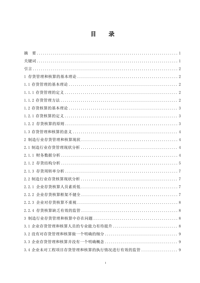 目录引言21存货管理和核算的基本理论.21.1存货管理的基本理论...1.1.1存货管理的定义...1.1.2存货管理方法....1.2存货核算的基本理论1.2.1存货核算的定义..31.2.2存货核算的原则...…31.3存货管理和核算的意义2制造行业存货管理和核算现状2.1制造行业存货管理现状分析..2.1.2存货结构分析......2.2制造行业存货核算现状分析..2.2.1企业存货核算人员素质低72.2.2企业存货核算框架不健全...72.2.3企业对存货核算不重视....2.2.4存货核算缺乏有效的监管.....3制造行业存货管理和核算中存在问题....·3.1企业存货管理和核算人员的专业能力有待提升.83.2没有对存货管理和核算做一个明确的细分....93.3企业存货管理和核算并没有一个明确概念.…·93.4企业未对工程项目存货管理和核算的执行情况进行有效的监管.…94对制造行业存货管理和核算的建议.·4.1提高企业存货管理和核算人员综合素质10104.3提高管理者和员工对企业存货管理和核算的认识......114.3.1提高管理者对企业存货管理和核算的认识.114.4转变对存货管理和核算的管理观念,创造良好成本控制环境....·125总结.…关于制造行业存货管理和核算中存在的问题及对策探讨摘要:随着实体经济的发展,现阶段我国的制造行业取得了很大的进步,而其中主要依靠制造企业所做出的巨大贡献,目前我国进入了经济体制全面改革的重要时期,因而我国的市场经济体制发生了较大的变化,对于制造企业来说,想要实现长远发展,想要增强自身核心竞争力,就需要依靠有效的成本管理手段。信息化时代的到来,使得各个企业之间的成本和利润空间日趋透明,为了获得更多的利润,企业方面必须去思考存货管理和核算的最优效果,以此来完成长效发展之路。本文首先对制造行业存货管理和核算的基本理论进行了介绍,然后分析了制造行业存货管理和核算现状,包括其存货管理和核算框架及存货管理和核算方法,其次对制造行业在成本管理方面所暴露出来的不足之处,并深入挖掘其原因,最终提出相应的策略建议,以期望能够达到提升制造行业整体管理水平和减少成本支出的目标。关键词:制造行业;存货管理;存货核算Discussion on Problems and Countermeasures in InventoryManagement and Accounting in Manufacturing IndustryAbstract:With the development of real economy,the manufacturing industry of our country has made greatprogress at the present stage,and it mainly depends on the great contribution made by the manufacturingenterprises.At present,our country has entered the important period of the overall reform of the economicsystem,so the market economy system of our country has changed greatly.With the advent of theinformation age,the cost and profit space between enterprises become more and more transparent.In orderto obtain more profits,enterprises must consider the optimal effect of inventory management andaccounting in order to achieve the long-term development.This paper first introduces the basic theory ofinventory management and accounting in manufacturing industry,and then introduces the current situationof inventory management and accounting in manufacturing industry,including its inventory managementand accounting framework and inventory management and accounting methods.Keywords:Construction Enterprises;Inventory control;Inventory accounting1