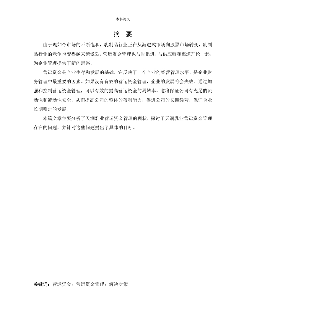 本科论文摘要由于现如今市场的不断饱和,乳制品行业正在从渐进式市场向股票市场转变,乳制品行业的竞争也变得越来越激烈。营运资金管理也与时俱进,与供应链和渠道理论一起,为企业管理提供了新的思路。营运资金是企业生存和发展的基础,它反映了一个企业的经营管理水平,是企业财务管理中最重要的因素。如果没有有效的营运资金管理,企业的发展将会失败。通过加强和控制营运资金管理,可以有效的提高营运资金的周转率。这将保证公司有充足的流动性和流动性安全,从而提高公司的整体的盈利能力,促进公司的长期经营,保证企业长期稳定的发展。本篇文章主要分析了天润乳业营运资金管理的现状,探讨了天润乳业营运资金管理存在的问题,并针对这些问题提出了具体的目标。关键词:营运资金;营运资金管理;解决对策本科论文AbstractDue to the continuous saturation of the market today,the dairy industry is changing froma gradual market to a stock market,and competition in the dairy industry has becomeincreasingly fierce.Working capital management is also advancing with the times.Togetherwith supply chain and channel theory,it provides new ideas for enterprise management.Working capital is the basis for the survival and development of an enterprise.It reflectsthe management level of an enterprise and is the most important factor in the financialmanagement of an enterprise.Without effective working capital management,enterprisedevelopment will fail.By strengthening and controlling working capital management,theworking capital turnover rate can be effectively improved.This will ensure that the companyhas sufficient liquidity and liquidity security,thereby improving the company's overallprofitability,promoting the company's long-term operation,and ensuring the company'slong-term stable development.This article mainly analyzes the current status of Tianrun Dairy's working capitalmanagement,discusses the problems of Tianrun Dairy's working capital management,andproposes specific goals for these issues.Key words:Working capital;working capital management;solutions本科论文广告页:文章写作一时一服务全天在线论文代笔(普刊、核心、本科、硕士,本科设计等)、开题报告、文献综述、答辩稿PPT、低于市场价维普、万方、知网查重、中外参考文献下载,文章论文发表(北核、科技核心、普刊)、文章修改,随时服务.诚信合作扫一扫添加微信如果添加不上可以添加微信号15671544033或GYLW002