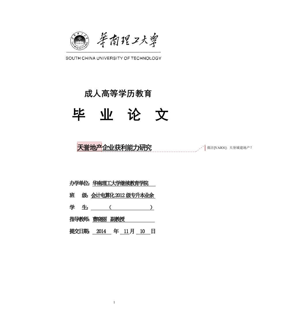 1SOUTH CHINA UNIVERSITY OF TECHNOLOGY成人高等学历教育毕业论文天誉地产企业获利能力研究,批注VAIOI]:天誉城建地产?办学弹位华南理工大学继续教育学院班级:会计电算化2012级专升本业馀学生)指导师曹晓鲡副授提交日期2014年11月10日1摘要盈利能力是指企业获取利润的能力。利润是公司内外有关各方都关心的中心问题、利润是投资者取得投资收益、债权人收取本息的资金来源,是经营者经营业绩和管理效能的集中表现,也是职工集体福利设施不断完善的重要保障。因此,上市公司的盈利能力分析十分重要。通过对上市公司的盈利能力进行分析,不仅能够反映公司过去的经营业绩,还能预测公司的发展前景。盈利能力分析的目的是利用盈利能力的有关指标反映和衡量公司经营业绩同时通过盈利能力分析来发现公司经营管理中存在的问题。批注VAIO2:参看样例修改关键词:盈利能力报表分析批注VAIO3:要3-5个AbstractProfitability is refers to the enterprise profit ability.Profit is the center problem,company inside and outside all parties are concerned about the profits of investors toobtain investment income,the creditor to collect principal source of funds,is theconcentrated expression of operator performance and management efficiency,andalso an important guarantee for the continuous improvement of the collective welfarefacilities.Therefore,analysis of the profitability of the listing Corporation is veryimportant.Based on the analysis of the profitability of the listing Corporation,notonly reflects the past performance of the company,development prospects alsoForecast Ltd.Profitability analysis is to reflect the index using the profitability andmeasure the business performance through the profitability analysis to find thecompany management problems.Key Words Profitability Analysis Report2目录目录摘要4444444*ABSTRACT.1绪论1.1选题的由来和意义1.3研究方法和论文结构L3.2论文结构.2广州市城建天誉房地产开发有限公司基本信息…2.1广州市城建天誉房地产开发有限公司基本信息..…2.2财务报表..2.2.1公司资产负债表2.2.2公司利润表.…2.2.3公司现金流量表3广州市城建天誉房地产开发有限公司资产经营盈利能力分析…3.1资产经营盈利能力指标分析.……3.1.3现金流量指标对资本经营盈利能力的补充分析.…3.1.4现金流量指标对资产经营盈利能力的补充分析4广州市城建天誉房地产开发有限公司商品经营盈利能力分析…4.1收入利润率分析4.2成本利润率分析4.3现金流量指标对商品经营盈利能力的补充参考文献