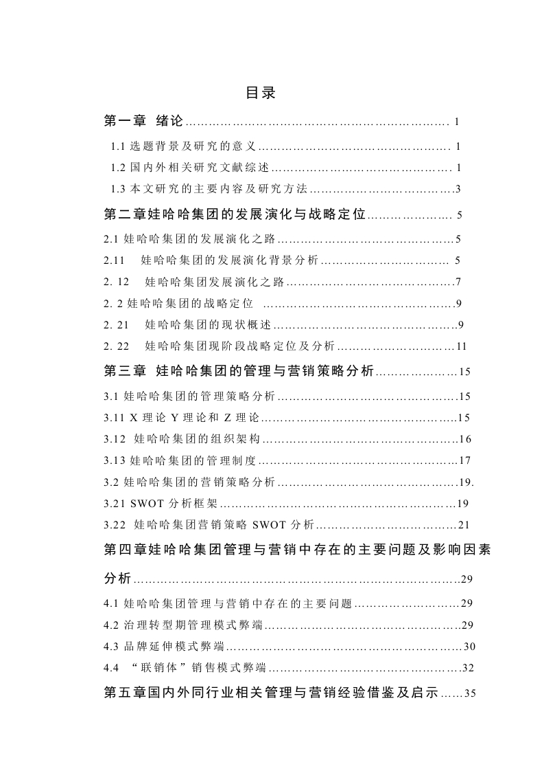 目录第一章绪论1.1选题背景及研究的意义.1.3本文研究的主要内容及研究方法.3第二章娃哈哈集团的发展演化与战略定位52.1娃哈哈集团的发展演化之路.52.11娃哈哈集团的发展演化背景分析…52.12娃哈哈集团发展演化之路72.2娃哈哈集团的战略定位….92.21娃哈哈集团的现状概述.92.22娃哈哈集团现阶段战略定位及分析11第三章娃哈哈集团的管理与营销策略分析.153.1娃哈哈集团的管理策略分析..….153.11X理论Y理论和Z理论……3.12娃哈哈集团的组织架构3.13娃哈哈集团的管理制度...173.2娃哈哈集团的营销策略分析.….19.3.21SW0T分析框架193.22娃哈哈集团营销策略SW0T分析.....21第四章娃哈哈集团管理与营销中存在的主要问题及影响因素4.1娃哈哈集团管理与营销中存在的主要问题…294.2治理转型期管理模式弊端..4.3品牌延伸模式弊端..304.4“联销体”销售模式弊端.32第五章国内外同行业相关管理与营销经验借鉴及启示.355.1华为集团,中西融合355.2宝洁公司,品牌延伸375.3康师傅饮料,通路精耕.……39第六章娃哈哈集团管理与营销对策及建议6.1娃哈哈集团管理对策及建议.436.2娃哈哈集团营销对策及建议.…….4471本文研究的主要结论.……497.2本文研究的不足及进一步展望....49参考文献51摘要摘要进入二十一世纪以来,我国的民营企业发展迅速,软饮料行业繁荣是民营企业昌盛的一个缩影。在这一市场上,作为国内饮料企业的娃哈哈应如何制定有效的管理和营销策略,提高公司管理效率以及产品的市场占有率是企业管理者应该关注的课题。本文以娃哈哈公司为对象,针对管理和营销工作中的实际情况,综合运用Z理论、SWOT分析方法以及品牌延伸等相关管理和营销理论,通过对公司内外部环境分析,识别出公司面临的机会与威胁以及相对于竞争对手的优势、劣势,最终提出公司的管理策略和营销策略的改进方向。本论文共包括七个部分,其中第一部分主要就论文选题的背景及意义、国内外研究现状和研究思路进行简要说明:第二部分就娃哈哈集团发展演化之路与战略定位进行阐述及梳理;第三部分分别运用Z理论、SWOT分析对公司的管理模式与营销模式行了详尽的分析:第四部分对娃哈哈集团管理和营销中存在的问题以及影响因素进行了阐述:第五部通过对国内外相关经验借鉴以得到启示;第六部分是对娃哈哈集团管理策略和营销策略改进提出建议;第七部分为本论文的结论部分,总结了本论文运用理论知识所解决的实际问题和有待进一步研究和探讨的问题。本文系统地构建了娃哈哈集团的管理体系和营销体系,其中既有管理模式和营销模式分析框架,也有明确的改进方向,可以为饮料行业乃至快速消费品企业管理策略和营销策略制执行提供参考。关键词:管理策略,营销策略,软饮料,娃哈哈集团