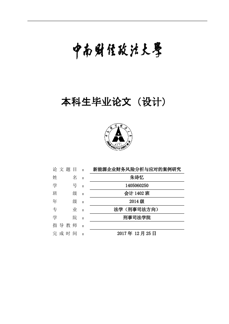 本科生毕业论文(设计)论文题目:新能源企业财务风险分析与应对的案例研究姓名朱诗忆学1405060250班会计1402班年级2014级专业法学(刑事司法方向)学院刑事司法学院指导教师完成时间:2017年12月25日中南财经政法大学2018届辅修双学位学位论文作者声明本毕业论文(设计)是在导师的指导下由本人独立撰写完成的,没有剽窃、抄袭、造假等违反道德、学术规范和其他侵权行为。对本论文(设计)的研究做出重要贡献的个人和集体,均已在文中以明确方式标明。因本毕业论文(设计)引起的法律结果完全由本人承担。毕业论文(设计)成果归中南财经政法大学所有。特此声明。作者专业:法学(刑事司法方向)作者学号1405060250作者签名2017年12月25日中南财经政法大学2018届辅修双学位学位论文新能源企业财务风险分与应对的案例研究朱诗忆The Case Analysis on Financial Risk Recognizingand Preventing of the New Energy CompanyZhu,Shiyi2017年12月25日