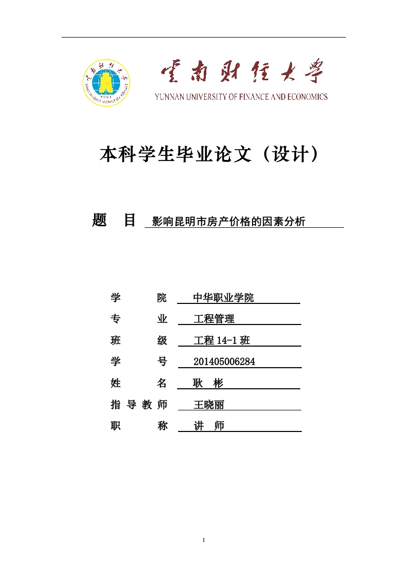 首页毕业论文范文模板影响昆明市房产价格的因素分析
