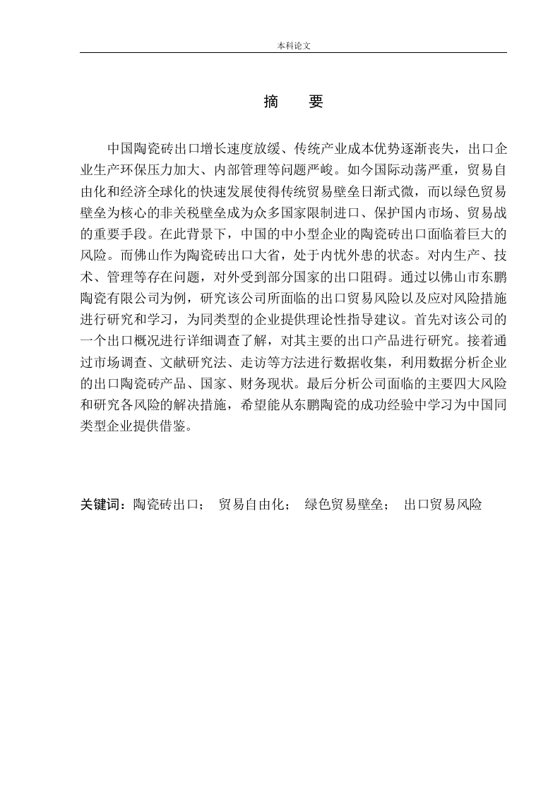 首页毕业论文范文模板161232102-韦如燕-佛山市东鹏陶瓷砖出口风险研究