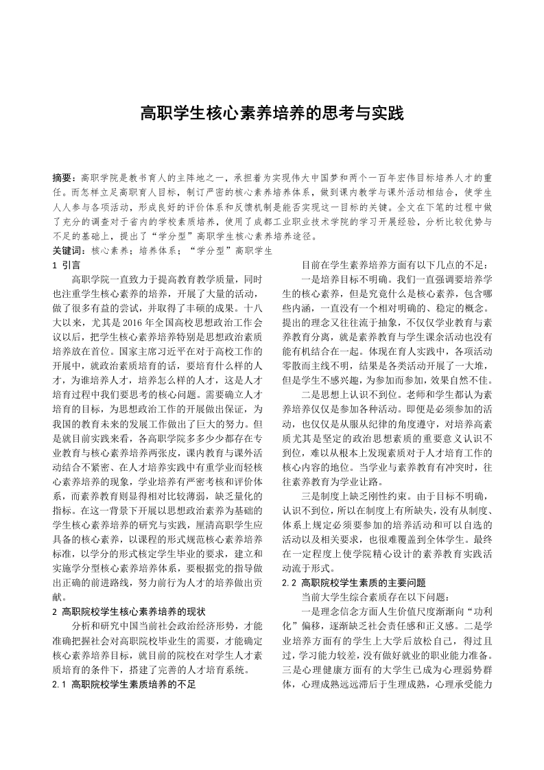 首页毕业论文范文模板高职学生核心素质培养思考与实践-王调品