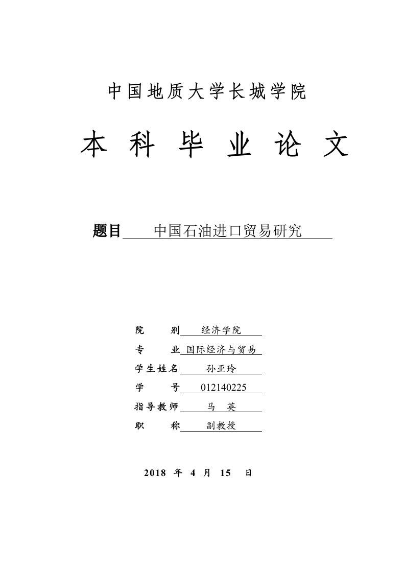 中国地质大学长城学院本科毕业论文题目中国石油进口贸易研究院别经济学院专业国际经济与贸易学生姓名孙亚玲学号012140225指导教师马英职称副教授2018年4月15日本科毕业生毕业论文(设计)诚信承诺书毕业论文中国石油进口贸易研究(设计)题目国际经济学生姓名孙亚玲专业学号012140225与贸易指导老师马英职称副教授所在院别经济学院诚信承诺本人慎重承诺和声明:我承诺在毕业论文(设计)活动中遵守学校有关规定,恪守学术规范,在本人的毕业论文中不剽窃、抄袭他人的学术观点、思想和成果,不篡改研究数据,如有违规行为发生,我愿承担一切责任,接受学校的处理。学生(签名):年月日中国地质大学长城学院毕业论文任务书学生姓名孙亚玲学号012140225专业班级14级国际经济与贸易2班指导教师马英职称副教授单位河北科技学院毕业论文题目中国石油进口贸易研究毕业论文主要内容和要求:主要内容:论文首先分析中国石油进口对外依赖程度不断加深的现状:其次搜集各种相关的信息与资料,提出中国石油进口面临的国内外问题,主要表现为石油进口规模加大和来源地相对集中以及进口运输贸易方式单一,贸易风险不断加剧等:最后提出我国应采从降低依赖、参与竞争、加强合作、确保安全等方面应对石油进口问题。要求:论文撰写要求思路清晰、内容充实、论点明确,论据充分,论证严密,语言通顺。撰写论文前应首先阅读相关的研究资料,掌握学术前沿动态,对相关理论著作要很好的把握,提高理论水平及思想深度。根据开题报告和老师提出的意见对论文提纲进行修改,确定大纲后认真撰写毕业论文。撰写论文结束后要根据老师的修改意见,认真反复的修改论文,并按照要求参加毕业论文的答辩,严格按照论文进度安排进行论文的写作。论文的格式、字数等撰写方面的要求参照《中国地质大学长城学院毕业论文(设计)撰写规范》。毕业论文主要参考资料:[1]李林.低油价背景下国际石油贸易格局与中国对策[J刀.中国石油大学学报,2016,(2):3-5.[2]尹佳音.中国石油进口安全影响因素分析[J刀].研究与探讨,2016,(11):29-33.[3]邵祎雯.中国石油进口贸易现状分析及未来发展建议[J刀.现代物业.现代经济,2013.30-31.[4]李振福.北极通道开发与中国石油进口通道格局变化[J].资源与科学,2015,(37)1639-1649.[5]苏欣.中国与伊朗石油合作探析[J刀.西安石油大学学报[J刀,2016.20-28.[6]张祺.中国石油进口依存度问题研究[D].武汉:武汉大学,2013.1-88.[7]张宇.中国石油进口分析[D].北京:中国地质大学,2013.25-35.[8]牟梅娟.中非石油贸易研究[D].青岛:中国海洋大学,2015.1937.[9]杨阳.中国原油进口来源结构的安全度分析及其优化[D].镇江:江苏大学,2016.1-53.[10]胡婷.中石油非洲经营风险及规避措施研究[D].成都:西南石油大学,2014.15-38.[11]李优树.中国石油供求变化趋势及石油安全问题分析[J刀.云南财经大学学报,2014,154-160.[12]Ezeanyanwu Michael E驴kemc.中尼石油贸易合作发展研究[D].合肥:安微大学,2017.6-21.[13]lyewumi Titilope Adeyele.EFFECT OF INCREASING CHINA OIL DEMAND ON WORLD OILPRICES[J].International Journal of Economics,Commerce and Management,2014,1-8.