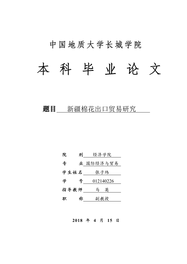 中国地质大学长城学院本科毕业论文题目新疆棉花出口贸易研究院别经济学院专业国际经济与贸易学生姓名张子纬学号012140226指导教师马英职称2018年4月15日本科毕业生毕业论文(设计)诚信承诺书毕业论文新疆棉花出口贸易研究(设计)题目国际经济学生姓名张子纬专业学号012140226与贸易指导老师马英职称副教授所在院别经济学院诚信承诺本人慎重承诺和声明:我承诺在毕业论文(设计)活动中遵守学校有关规定,恪守学术规范,在本人的毕业论文中不剽窃、抄袭他人的学术观点、思想和成果,不篡改研究数据,如有违规行为发生,我愿承担一切责任,接受学校的处理。学生(签名):年月日中国地质大学长城学院毕业论文任务书学生姓名张子纬学号012140226专业班级14级国际经济与贸易2班指导教师马英职称副教授单位河北科技学院毕业论文题目新疆棉花出口贸易研究毕业论文主要内容和要求:主要内容:论文首先分析我国新疆棉花的出口规模、种类、地区的现状:其次搜集各种相关的信息与资料,提出新疆棉花出口面临的问题,主要表现为国内棉价高于国际棉价,政府调控职能定位不清,棉花的产量质量问题等:最后提出我国应采取加强对我国棉花生产的支持和保护,构建新疆棉花现代流通体系,积极利用新形势下的一带一路政策等方面应对棉花出口问题。要求:论文撰写要求思路清晰、内容充实、论点明确,论据充分,论证严密,语言通顺。撰写论文前应首先阅读相关的研究资料,掌握学术前沿动态,对相关理论著作要很好的把握,提高理论水平及思想深度。根据开题报告和老师提出的意见对论文提纲进行修改,确定大纲后认真撰写毕业论文。撰写论文结束后要根据老师的修改意见,认真反复的修改论文,并按照要求参加毕业论文的答辩,严格按照论文进度安排进行论文的写作。论文的格式、字数等撰写方面的要求参照《中国地质大学长城学院毕业论文(设计)撰写规范》。毕业论文主要参考资料:[1]雷亚平.中国棉花产业发展现状及展望[J刀.农业展望,2014,(9):43-47.[2]田立文.新疆棉花补贴政策、存在问题及对策研究[J刀.新疆农业科学,2015,52(7):1359-1367.[3]肯巴提乌拉力.新疆棉花出口影响因素实证分析[J刀.中国棉花,2013.8-12.[4]张正文.新疆棉花产业发展研究[D.乌鲁木齐:新疆大学.2013.1-10.[5]袁平红.中国棉花产业流通现状、问题与对策[J刀.中国棉麻产业经济研究,2016.17-27.[6]何文彬.“一带一路”倡议背景下中国中亚金融合作的框架基础与层次安排[J刀.湖北社会科学,2017,(7):72-83.[7]贺林均.基于C4分析的新疆棉花产业集群形成中的自然环境因素限制和影响分析[J刀.经济地理,2013,(11):97-103.[8]刘志雄.开放条件下中国棉花安全状况评估[J刀.国际贸易问题,2013,(2):28-37[9]刘志雄.我国棉花国内支持政策对世界棉花市场影响研究[J刀.农业经济问题,2014,(8)33-39[10]李元太.新形势下新疆优势农产品中亚市场研究[D].乌鲁木齐:新疆农业大学.2016.1-7.[11]岳会.解读棉花目标价格改革新政点评新疆棉花价改实施效果[J刀.新疆农垦经济,2015.1-9.[12]Mark Leipnik.Agriculture and Food Production in China [J].Springer,2014,(3):16-28.[13]Blake.Cotton industry evolves to survive major challenge[J.Western Farm Press,2013,(5):1-9.[14]Philips.Cotton Prices,Demand Remain Stable[J].Textile World,2013,(8):36-46.