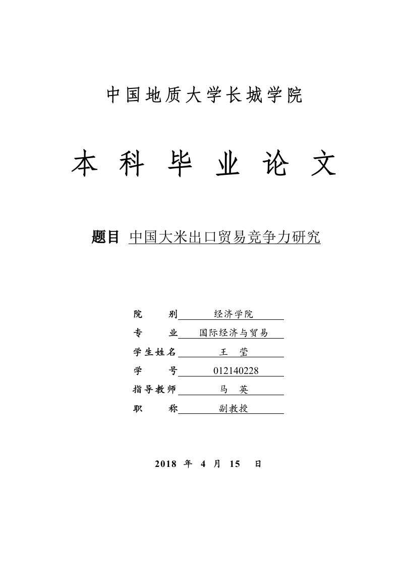 中国地质大学长城学院本科毕业论文题目中国大米出口贸易竞争力研究院别经济学院专业国际经济与贸易学生姓名王莹学号012140228指导教师马英职称副教授2018年4月15日本科毕业生毕业论文(设计)诚信承诺书毕业论文中国大米出口贸易竞争力研究(设计)题目国际经济学生姓名王莹专业学号012140228与贸易指导老师马英职称副教授所在院别经济学院诚信承诺本人慎重承诺和声明:我承诺在毕业论文(设计)活动中遵守学校有关规定,恪守学术规范,在本人的毕业论文中不剽窃、抄袭他人的学术观点、思想和成果,不篡改研究数据,如有违规行为发生,我愿承担一切责任,接受学校的处理。学生(签名):年月日中国地质大学长城学院毕业论文任务书学生姓名王莹学号012140228专业班级14级国际经济与贸易2班指导教师马英职称副教授单位中国地质大学长城学院毕业论文中国大米出口贸易竞争力研究题目毕业论文主要内容和要求:主要内容:论文首先分析了中国大米的出口贸易规模、出口市场等现状:其次搜集各种相关数据、信息与资料,全面系统的论述了大米出口贸易的基本问题,利用市场占有率、贸易竞争优势指数、显性比较优势指数综合评价中国大米的国际竞争力:最后提出促进中国大米出口的对策:发展大米产业化经营、促进大米质量提升、拓宽国际市场、加强国际对话等,以此提升中国大米出口贸易的国际竞争力。要求:论文撰写要求思路清晰、内容充实、论点明确,论据充分,论证严密,语言通顺。撰写论文前应首先阅读相关的研究资料,掌握学术前沿动态,对相关理论著作要很好的把握,提高理论水平及思想深度。根据开题报告和老师提出的意见对论文提纲进行修改,确定大纲后认真撰写毕业论文。撰写论文结束后要根据老师的修改意见,认真反复的修改论文,并按照要求参加毕业论文的答辩,严格按照论文进度安排进行论文的写作。论文的格式、字数等撰写方面的要求参照《中国地质大学长城学院毕业论文(设计)撰写规范》。毕业论文主要参考资料:[1]田园.我国大米国际竞争力分析及提升对策-一基于与泰国的比较[J刀.经济问题,2013,(6):121-124.[2]魏斌.中国粮食进出口现状及未来增加进口可行性分析[J].农业展望,2014,10(1):5360.[3]穆露露.中国稻米进出口贸易状况及应对策略探讨[J刀.改革与开放,2016,(1):60-61.[4]陈博文.基于市场视角对我国大米进口市场结构的研究[J刀.国际贸易问题,2015,(3):118-127.[5]满瑞琦.中国大米出口贸易中存在的问题及对策[J刀.当代经济,2013,(21):74-75.[6]冯晓.中国大米的比较优势实证分析[J].现代经济信息,2014,(17):374-374.[7]张大泽.关于我国水稻种植机械化的研究[J刀.吉林农业,2014,(10):27-27.[8]李腾飞.我国稻米产业的发展现状、面临困境及应对策略研究[J刀].食品工业,2016,37(10):224-228.[9]寇光涛.东北稻米全产业链增值的创新路径及机制研究[D].北京:中国农业大学,2017.3-11.[10]陈派.中国与越南、泰国大米进出口竞争力比较分析[D].南宁:广西大学,2014.2-9.[11]吕思铭.中国大米的国际竞争力研究[D].哈尔滨:黑龙江大学,2016.1-20.[12]罗雪曼.泰国与越南大米出口竞争力比较研究[D].南宁:广西大学,2016.9-13.[13]张帅.我国扩大从东盟进口大米研究[D].大连:东北财经大学,2014.1-21.[14]J.Kim.regionalism Rice Trade in Southeast and Northeast Asia:Making LiberalizationWork[J].Journal of International Area Studies,2014,21(2):83-98.