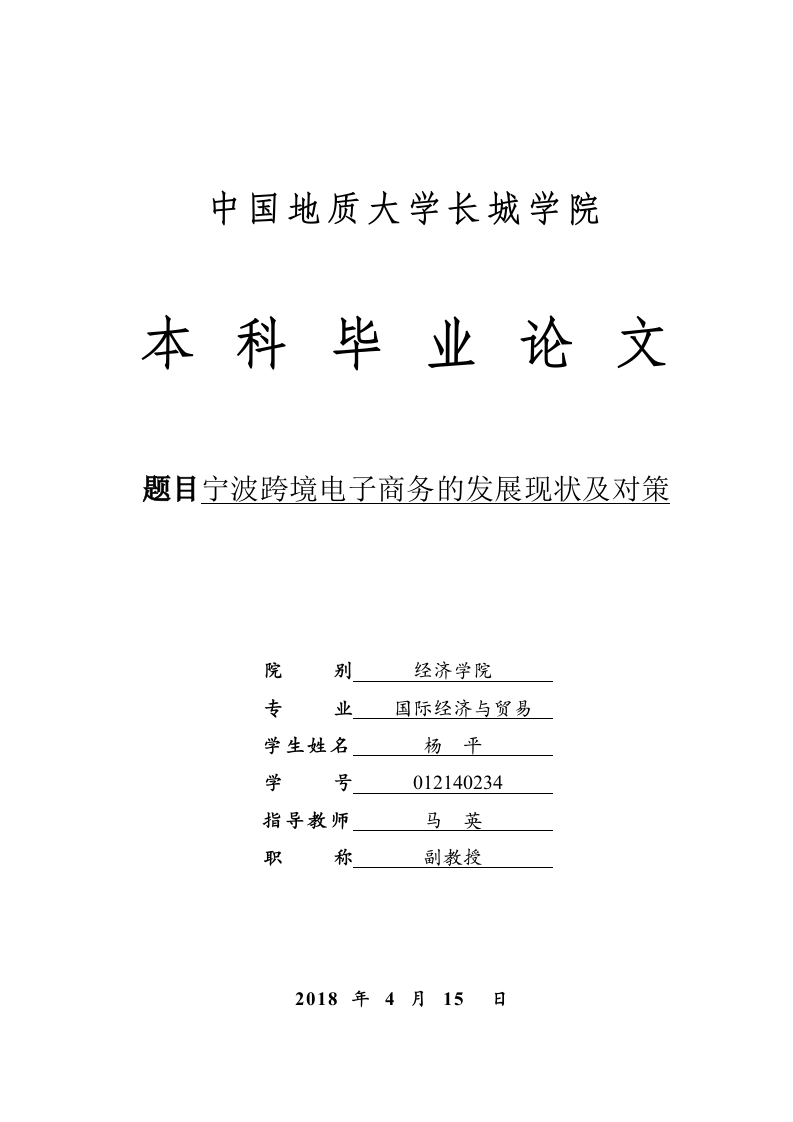 中国地质大学长城学院本科毕业论文题目宁波跨境电子商务的发展现状及对策院别经济学院专业国际经济与贸易学生姓名杨平学号012140234指导教师马英职称副教授2018年4月15日本科毕业生毕业论文(设计)诚信承诺书毕业论文宁波跨境电子商务的发展现状及对策(设计)题目国际经济学生姓名杨平专业学号012140234与贸易指导老师马英职称副教授所在院别经济学院诚信承诺本人慎重承诺和声明:我承诺在毕业论文(设计)活动中遵守学校有关规定,恪守学术规范,在本人的毕业论文中不剽窃、抄袭他人的学术观点、思想和成果,不篡改研究数据,如有违规行为发生,我愿承担一切责任,接受学校的处理。学生(签名):年月日中国地质大学长城学院毕业论文任务书学生姓名杨平学号012140234专业班级14级国际经济与贸易2班指导教师马英职称副教授单位中国地质大学长城学院毕业论文宁波跨境电子商务发展现状及对策题目毕业论文主要内容和要求:主要内容:论文首先讲述了宁波跨境电子商务的发展现状:其次分析了在后续发展工程中面临的很多问题,例如:跨境电商平台落后、跨境电子商务物流配送缓慢、跨境电子商务支付安全性不够、法规不健全、跨境电子商务专业人才紧缺、跨境电子商务营销水平不高等:最后则是对此相应的问题提出解决措施:选择优质的电商平台、发展快速低价安全物流服务、采用安全方便的国际电子支付手段、引进培养综合性国际电商人才、提高国际网络营销水平。要求:论文撰写要求思路清晰、内容充实、论点明确,论据充分,论证严密,语言通顺。撰写论文前应首先阅读相关的研究资料,掌握学术前沿动态,对相关理论著作要很好的把握,提高理论水平及思想深度。根据开题报告和老师提出的意见对论文提纲进行修改,确定大纲后认真撰写毕业论文。撰写论文结束后要根据老师的修改意见,认真反复的修改论文,并按照要求参加毕业论文的答辩,严格按照论文进度安排进行论文的写作。论文的格式、字数等撰写方面的要求参照《中国地质大学长城学院毕业论文(设计)撰写规范》。毕业论文主要参考资料:[1]来有为,王开前.中国跨境电子商务发展形态、障得性因素及其下一步[J].改革,2014,(⑤):1-30.[2]鄂立彬,黄永稳.国际贸易新方式:跨境电子商务的最新研究[J].东北财经大学学报,2014,(08):13-32.[3]薛源.跨境电子商务交易全球性网上争议解决体系的构建[J].对外经济贸易大学学报,2014,(8):5-19[4]王外连,王明宇,刘淑贞.中国跨境电子商务的现状分析及建议[J刀.电子商务,2013,(9):937.[5]曹淑艳,李振欣.跨境电子商务第三方物流模式研究[J刀.电子商务,2013,(03):13-31.[6]徐思怡.宁波中小企业发展跨境电子商务战略研究[J刀.经济研究导刊,2017(01):1-25.[7]赵丽娜.我国跨境电子商务的政府扶持政策研究[D].长春:东北财经大学,2016:2-19.[8]徐萌萌.中国跨境电商发展的现状及问题研究一基于阿里巴巴的SW0T分析[D].安微:安徽大学,2016:1-41.[9]冯志豪:蔡筱霞.跨境电子商务对宁波商圈进出口贸易的影响及对策分析[J刀.中国商论,2016,(27):4-29.[10]陈宝英.我国跨境电商发展现状和对策研究[J].知识经济,2017,(42):11-37[11]王明宇,廖蓁.我国跨境电商的主要问题和对策研究[J].中国商贸,2015,(27):21-35.[12]张雪梅,胡晓青.宁波市跨境电商物流协同创新研究[J刀.现代营销,2016,(13):13-45.