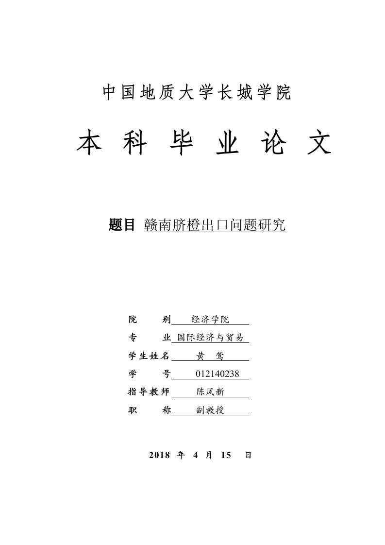中国地质大学长城学院本科毕业论文题目赣南脐橙出口问题研究院别经济学院专业国际经济与贸易学生姓名黄莺学号012140238指导教师陈凤新职称副教授2018年4月15日本科毕业生毕业论文(设计)诚信承诺书毕业论文赣南脐橙出口问题研究(设计)题目国际经济学生姓名黄莺专业学号012140238与贸易指导老师陈凤新职称副教授所在院别经济学院诚信承诺本人慎重承诺和声明:我承诺在毕业论文(设计)活动中遵守学校有关规定,恪守学术规范,在本人的毕业论文中不剽窃、抄袭他人的学术观点、思想和成果,不篡改研究数据,如有违规行为发生,我愿承担一切责任,接受学校的处理。学生(签名):年月日中国地质大学长城学院毕业论文任务书学生姓名黄莺学号012140238专业班级14级国际经济与贸易2班指导教师陈凤新职称副教授单位河北大学毕业论文题目赣南脐橙出口问题研究毕业论文主要内容和要求:主要内容:论文分析的是赣南脐橙的出口现状并提出扩大出口的措施。首先从自然资源优越、产品品质优良、区位优势明显、劳动力成本较低等方面的优势进行分析:其次从出口量占总产量的比重低、出口价格水平低于世界平均价格、出口市场相对集中、出口企业增多等方面分析了赣南脐橙的出口现状:再其次列出产品的商品化处理程度低、出口缺乏质量标准、品牌杂乱、出口收汇风险较高、出口时间集中等方面的问题并进行原因分析:最后提出扩大出口的措施:培育出口龙头企业、优化品种结构和提升质量、运用好原产地标志制度、完善基础设施、运用出口信用保险规避收汇风险等。要求:论文撰写要求思路清晰、内容充实、论点明确,论据充分,论证严密,语言通顺。撰写论文前应首先阅读相关的研究资料,掌握学术前沿动态,对相关理论著作要很好的把握,提高理论水平及思想深度。根据开题报告和老师提出的意见对论文提纲进行修改,确定大纲后认真撰写毕业论文。撰写论文结束后要根据老师的修改意见,认真反复的修改论文,并按照要求参加毕业论文的答辩,严格按照论文进度安排进行论文的写作。论文的格式、字数等撰写方面的要求参照《中国地质大学长城学院毕业论文(设计)撰写规范》。毕业论文主要参考资料:[1]邓淑华,黄小兵.柑橘出口贸易研究一以赣南脐橙为例[刀.柑橘之家技术产业联盟,2017,(6):21-26.[2]徐吉良.对原产地地理标志工作的思考和建议[J刀.中国国门时报,2016,(1):11-16[3]习小林.以习总书记的五种思维研究赣南脐橙产业[D].江西:中共赣州市委党校,2017.29-31.[4]赖晓桦,凌真新.由绿色壁垒谈赣南脐橙[J刀.江西园艺,2015,(3):8-11.[5]陈亚艳,罗新诂.赣南脐橙出口特点及竞争力影响因素实证分析[刀.中国南方果树,2015,(1):126-132.[6]陈亚艳,李越荣.江西与赣粤闽滇脐橙出口竞争力比较研究[D].江西:赣南师范学院商学院,2016.187-192.[7]张胜荣.基于钻石模型的赣南脐橙产业国际竞争力研究[J刀.西部经济管理论坛,2015,(1):50-54.[8]邓淑华,黄小光.基于自由贸易理论的赣南脐橙出口研究[J刀.价格月刊,2017,(476):77-81.[9]陈亚艳,接云云,李越荣,罗斌,罗显琦.赣南脐橙品质与营销的制约因素及产业发展对策[刀.农业经济农业管理,2016,(12):153-157.[10]刘家祁,王光华,黄小勇.构建五大体系,推进信丰脐橙产业转型发展[刀.现代园艺,2018,(1):33-34.