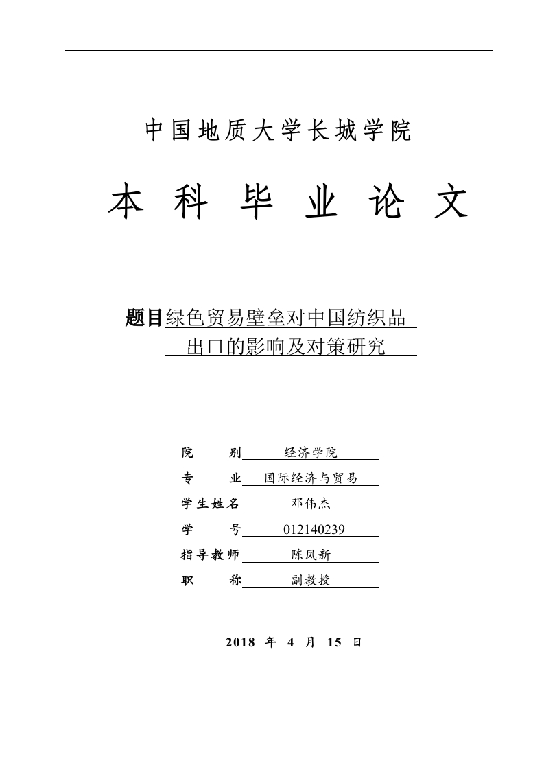 中国地质大学长城学院本科毕业论文题目绿色贸易壁垒对中国纺织品出口的影响及对策研究院别经济学院专业国际经济与贸易学生姓名邓伟杰学号012140239指导教师陈凤新职称副教授2018年4月15日本科毕业生毕业论文(设计)诚信承诺书毕业论文绿色贸易壁垒对中国纺织品出口的影响及对策研究(设计)题目国际经济学生姓名邓伟杰专业学号012140239与贸易指导老师陈凤新职称副教授所在院别经济学院诚信承诺本人慎重承诺和声明:我承诺在毕业论文(设计)活动中遵守学校有关规定,恪守学术规范,在本人的毕业论文中不剽窃、抄袭他人的学术观点、思想和成果,不篡改研究数据,如有违规行为发生,我愿承担一切责任,接受学校的处理。学生(签名):年月日中国地质大学长城学院毕业论文任务书学生姓名邓伟杰学号012140239专业班级14级国际经济与贸易2班指导教师陈凤新职称副教授单位河北大学毕业论文绿色贸易壁垒对中国纺织品出口的影响及对策研究题目毕业论文主要内容和要求:主要内容:论文首先通过搜集各种相关的信息与资料,对相关数据进行分析,从而对我国纺织品出口遭遇绿色贸易壁垒的现状进行分析和评价:其次提出中国纺织品出口遭遇绿色贸易壁垒导致市场准入标准提高、出口成本增加,竞争力减弱、贸易摩擦增大,企业风险加大等问题:最后提出提高中国纺织品质量、加大对研究绿色产品的经济支持、完善绿色纺织品生态标准及相关法规,为我国纺织品应对绿色贸易壁垒提供建议。要求:论文撰写要求思路清晰、内容充实、论点明确,论据充分,论证严密,语言通顺。撰写论文前应首先阅读相关的研究资料,掌握学术前沿动态,对相关理论著作要很好的把握,提高理论水平及思想深度。根据开题报告和老师提出的意见对论文提纲进行修改,确定大纲后认真撰写毕业论文。撰写论文结束后要根据老师的修改意见,认真反复的修改论文,并按照要求参加毕业论文的答辩,严格按照论文进度安排进行论文的写作。论文的格式、字数等撰写方面的要求参照《中国地质大学长城学院毕业论文(设计)撰写规范》。毕业论文主要参考资料:[1]魏冬梅.我国纺织服装行业对绿色贸易壁垒的对策研究[D].辽宁省:辽宁工程技术大学,2017,(9):1-33.[2]刑娟.绿色贸易壁垒对我国纺织品出口的影响[J].对外经贸实务,2015,(7):50-52[3]王寒琦.欧盟技术性贸易壁垒及其对我国的影响[J刀.黑龙江对外经贸,2015,(10):44-46.[4]彭妹.中国纺织业应对绿色贸易壁垒的策略选择[J刀.产业与科技论坛,2016,(3):51-53.[5]路世昌.绿色壁垒对我国纺织服装行业的影响及对策[J刀.对外开放,2014,(1):24-25.[6]郑小波.绿色贸易壁垒对纺织品出口的影响分析及对策[J].价格月刊,2014,(5):33-35.[7]邹小芳.绿色贸易壁垒对中国纺织业出口的影响及对策[J刀.经济研制导刊,2016,(3):10-12.[8]黄燕华.绿色壁垒对我国纺织品出口的影响及对策研究[J刀.法制与社会,2016,(20):2931[9]陈琦.绿色贸易壁垒对我国纺织品出口的影响及对策[D].邵阳学院,2014,(5):28-30.[10]史自力.中国纺织品贸易应对新时期之战略思考[J].经济与管理研究,2015,(11):92-96.[11]杨庆许.绿色贸易壁垒对我国纺织品贸易的形响[J刀.江苏商贸,2017,(12):50-51.[12]Judith M.Dean.Does Trade Liberalization Harm the Environmental a new test [J].Canadian Journalof Economics,2015,(3):15-17.