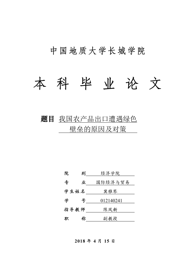 中国地质大学长城学院本科毕业论文题目我国农产品出口遭遇绿色壁垒的原因及对策院别经济学院专业国际经济与贸易学生姓名冀雅琴学号012140241指导教师陈凤新职称副教授2018年4月15日本科毕业生毕业论文(设计)诚信承诺书毕业论文我国农产品出口遭遇绿色贸易壁垒的成因及对策(设计)题目国际经济学生姓名冀雅琴专业学号012140241与贸易指导老师陈凤新职称副教授所在院别经济学院诚信承诺本人慎重承诺和声明:我承诺在毕业论文(设计)活动中遵守学校有关规定,恪守学术规范,在本人的毕业论文中不剽窃、抄袭他人的学术观点、思想和成果,不篡改研究数据,如有违规行为发生,我愿承担一切责任,接受学校的处理。学生(签名):年月日中国地质大学长城学院毕业论文任务书学生姓名冀雅琴学号012140241专业班级14级国际经济与贸易2班指导教师陈凤新职称副教授单位河北大学毕业论文我国农产品出口遭遇绿色贸易壁垒的成因及对策题目