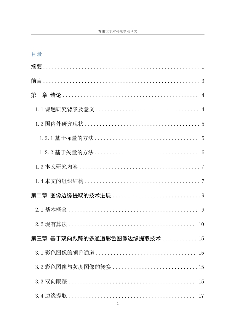苏州大学本科生毕业论文目录1341.1课题研究背景及意义..41.2国内外研究现状...51.2.1基于标量的方法...51.2.2基于矢量的方法...671.4本文的组织结构..第二章图像边缘提取的技术进展910第三章基于双向跟踪的多通道彩色图像边缘提取技术·153.1彩色图像的颜色通道....153.3双向跟踪..1517苏州大学本科生毕业论文第四章实验结果与分析.·204.1BSDS500数据集和测评指标介绍20214.3主观性测评...23第五章总结与展望.255.1总结252527302苏州大学本科生毕业论文摘要图像的边缘是图像的基本特征,也是图像信息的最大集中区域,边缘提取对图像场景的识别与理解十分重要,在计算机视觉系统的应用领域中具有关键作用。图像局部特征变化不连续的这部分像素的集合叫做边缘,例如灰度值、颜色、纹理结构等的突变,边缘可能存在于图像中的物体和物体之间、物体和背景之间。边缘提取可以广泛应用在特征提取、图像分割、图像识别等领域,是进行图像理解基本的预处理过程。进行边缘提取,可以在减少数据量的同时表达图像的特征,为图像识别提供有用的信息。对于人类视觉系统来说,识别和理解自然图像是一个渐进和分层的过程。鉴于这一原理,我们提出了一种多通道的边缘提取技术,该技术的新颖之处在于使用了双向跟踪策略。首先对彩色图像的三个通道(R、G、B)分别进行边缘检测:再按照边缘数目排序:对边缘数目少的边缘图下跟踪(Forward tracking,FT)到相邻的边缘数目多的边缘图,然后对下跟踪的结果进行到边缘数目多的边缘图的上确认(Backwardconfirm,BC)操作:迭代双向跟踪得到最终输出结果。采用双向跟踪的策略,可以融合不同通道下的边缘信息,在保证边缘精度的同时有效抑制噪声,生成的边缘比现有的一些算法产生的边缘图效果更好。实验结果表明,本文算法在主观评测和客观性能指标评估中都优于目前先进的边缘提取算法。关键词:彩色图像;边缘提取;双向跟踪:上跟踪:下确认;彩色通道