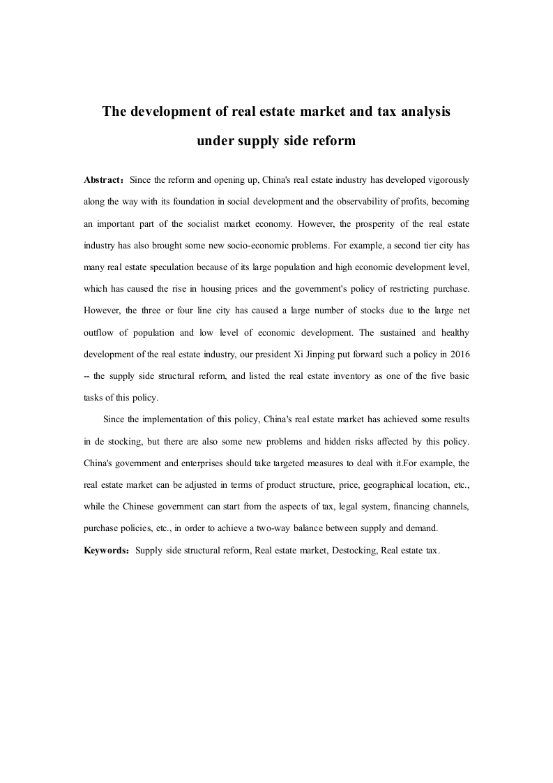 The development of real estate market and tax analysisunder supply side reformAbstract:Since the reform and opening up,China's real estate industry has developed vigorouslyalong the way with its foundation in social development and the observability of profits,becomingan important part of the socialist market economy.However,the prosperity of the real estateindustry has also brought some new socio-economic problems.For example,a second tier city hasmany real estate speculation because of its large population and high economic development level,which has caused the rise in housing prices and the govemment's policy of restricting purchase.However,the three or four line city has caused a large number of stocks due to the large netoutflow of population and low level of economic development.The sustained and healthydevelopment of the real estate industry,our president Xi Jinping put forward such a policy in 2016--the supply side structural reform,and listed the real estate inventory as one of the five basictasks of this policy.Since the implementation of this policy,China's real estate market has achieved some resultsin de stocking,but there are also some new problems and hidden risks affected by this policy.China's govemment and enterprises should take targeted measures to deal with it.For example,thereal estate market can be adjusted in terms of product structure,price,geographical location,etc.,while the Chinese govemment can start from the aspects of tax,legal system,financing channels,purchase policies,etc.,in order to achieve a two-way balance between supply and demand.Keywords:Supply side structural reform,Real estate market,Destocking,Real estate tax.目录第1章绪论…11.1.1房地产供给侧结构性改革的背景分析121.2课题研究方法和内容…·21.2.2研究内容.…3第2章供给侧结构性改革与房地产市场.…42.1.1供给与需求.…42.1.3供给侧结构性改革理论...52.2房地产与房地产市场...62.3房地产供给侧改革动因分析.·7第3章房地产税收分析…3.1房地产税收.93.1.1税收理论.93.1.2税收体系.93.2房地产发展与房地产税收123.2.1存在的问题.1213第4章房地产市场发展现状.154.1我国房地产去库存现状。154.1.1房地产库存定义.…154.1.2我国房地产去库存政策实施效果分析..154.2房地产市场发展存在的问题.…4.2.1房地产总体库存高,收入差距导致需求不足174.2.2房地产相关的法律体系还不够健全..184.2.3大中小型城市去库存效果差异明显...184.2.4房地产开发商大规模的开发建设..18第5章房地产市场供给侧改革完善对策.195.1加大普通民众的购房消费补助,刺激中低收入群体消费...195.2健全法律规章体系.…195.3三四线城市要积极融入大城市圈.…1920第6章总结.21第1章绪论1.1研究背景及意义1.1.1房地产供给侧结构性改革的背景分析从1978年改革开放以来,我国的社会主义经济发展得很快,中国已经成为了世界经济大国,影响着全球经济格局,人们的生活水平不断提高,人均收入和世界上的其他国家相比也达到了中等及以上水平。但是,也出现了一些问题:例如由计划生育政策带来的人口老龄化现象,使得人口红利缩减:由于人口基数大贫富差距大,导致人均收入一直在“中等”而难以提高:以及由于其它国家经济发展变化所带来的世界经济格局的调整等,在这一系列国内国外因素的综合影响下,中国经济发展进入一个新的阶段一一“新常态”。这一新阶段表现在社会主义市场经济中出现了以下现象:产品的生产成本不断上升、供给与需求错配、市场机制运行不畅,消费上升而投资下降、居民收入有所增加而企业利润率下降等等。①总之,有一个很明显的趋势就是中国的经济结构性正在分化。为了应对这一问题,就需要我们在正视传统需求管理的同时,不能忘了优化与它相对应的供给侧机制。我们需要改善供给侧环境,这样才能增强那些微观经济主体的发展活力,让它们成为我们国家经济长期稳定发展的新动力。因此,我们的习近平主席在2015年的11月10日主持召开中央财经领导小组的第十一次会议时,就提出了供给侧结构性改革这一概念,并且也制定了这一政策下的几项具体措施,其中一项就是针对我国房地产市场现有供需情况提出的去库存措施。之所以提出这一政策是因为我国房地产行业经过三四十年的发展壮大,现已成为了我国的支柱产业之一,对于国民经济影响重大。衣食住行是人们满足生存条件的四个基本要求,房地产业对于我们的生活来说息息相关。简单来说,建学校需要房子、建医院需要房子、酒店建旅游区等等众多的服务行业都依赖于房地@冯志峰.供给侧结构性改革的理论逻辑与实践路径).经济问题,2016(0212-17.1