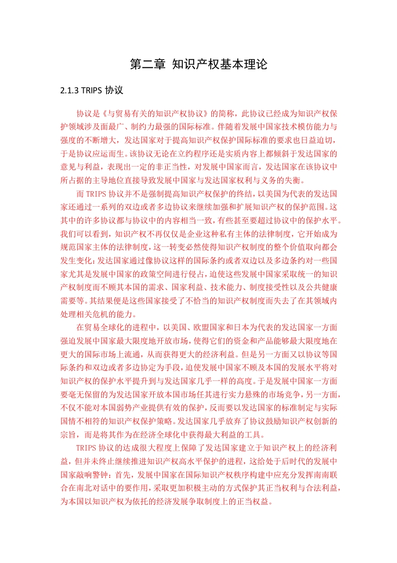 第二章知识产权基本理论2.1.3 TRIPS协议协议是《与贸易有关的知识产权协议》的简称,此协议已经成为知识产权保护领域涉及面最广、制约力最强的国际标准。伴随着发展中国家技术模仿能力与强度的不断增大,发达国家对于提高知识产权保护国际标准的要求也日益迫切,于是协议应运而生。该协议无论在立约程序还是实质内容上都倾斜于发达国家的意见与利益,表现出一定的非正当性,对发展中国家而言,发达国家在该协议中所占据的主导地位直接导致发展中国家与发达国家权利与义务的失衡。而TRIPS协议并不是强制提高知识产权保护的终结,以美国为代表的发达国家还通过一系列的双边或者多边协议来继续加强和扩展知识产权的保护范围。这其中的许多协议都与协议中的内容相当一致,有些甚至要超过协议中的保护水平。我们可以看到,知识产权不再仅仅是企业这种私有主体的法律制度,它开始成为规范国家主体的法律制度,这一转变必然使得知识产权制度的整个价值取向都会发生变化:发达国家通过像协议这样的国际条约或者双边以及多边条约对一些国家尤其是发展中国家的政策空间进行侵占,迫使这些发展中国家采取统一的知识产权制度而不顾其本国的需求、国家利益、技术能力、制度接受性以及公共健康需要等。其结果便是这些国家接受了不恰当的知识产权制度而失去了在其领域内处理相关危机的能力。在贸易全球化的进程中,以美国、欧盟国家和日本为代表的发达国家一方面强迫发展中国家最大限度地开放市场,使得它们的资金和产品能够最大限度地在更大的国际市场上流通,从而获得更大的经济利益。但是另一方面又以协议等国际条约和双边或者多边协定为手段,迫使发展中国家不顾及本国的发展水平将对知识产权的保护水平提升到与发达国家几乎一样的高度。于是发展中国家一方面要毫无保留的为发达国家开放本国市场任其进行实力悬殊的市场竞争,另一方面,不仅不能对本国弱势产业提供有效的保护,反而要以发达国家的标准制定与实际国情不相符的知识产权保护策略。发达国家几乎放弃了协议鼓励知识产权创新的宗旨,而是将其作为在经济全球化中获得最大利益的工具。TRIPS协议的达成很大程度上保障了发达国家建立于知识产权上的经济利益,但并未终止继续推进知识产权高水平保护的进程,这给处于后时代的发展中国家敲响警钟:首先,发展中国家在国际知识产权秩序构建中应充分发挥南南联合在南北对话中的要作用,采取更加积极主动的方式保护其正当权利与合法利益,为本国以知识产权为依托的经济发展争取制度上的正当权益。第三章国内外知识产权战略对比分析3.1国外知识产权战略现状分析先分析外国知识产权保护的状况,从立法方面来看,1474年3月,威尼斯共和国颁布了《发明人法规》,这是世界上第一部专利法:1623年,英国颁布了《垄断法》,这部法律同样是专利法,其影响力远大于威尼斯共和国的《发明人法规》,被认为是资本主义国家专利法的始祖,也是世界专利法历史上的一个里程碑:87年后,1710年4月,同样是在英国,世界上第一步版权法《安娜女王法令》诞生。西方发达国家在知识产权立法方面花费了数百年来建立一个完善的法律体系,这也代表着发达国家已经有了数百年的知识产权积累量,十八世纪中叶,第一次工业革命的浪潮席卷了全世界,以美国为首发达国家纷纷趁机加快推进本国知识产权体系的建立,时至今日,西方发达国家在当前主流工业产业保有大部分核心技术的知识产权。3.1.1德国的知识产权战略在发达国家,知识产权最主要的载体是企业,同时知识产权战略的主体也是企业,这是普遍现象。第二次世界大战结束后,尽管德国作为战败国在军事上受到巨大的打击,但是在经济方面却反而迅速崛起并保持着高速的发展势头,其国内生产总值和人均国内生产总值都达到了世界前列。德国的工业企业科学有效地对知识产权制度进行运用,稳中求进,在保持核心竞争力的基础上不断提升其在工业市场中的地位,使德国在世界范围内持续拥有这足够强大的竞争力。进入21世纪,面对知识经济和经济全球化时代,以知识经济为基础的德国尤其依赖于其创新能力的保护。政府更加致力于推进知识产权战略工作。宏观层面,在以企业为轴心的基础上,德国形成了一套较为成熟的“企业主体、国家支持、员工努力”的知识产权战略管理和法律保护体系,积极实施了以专利为重点的知识产权战略,打造了一大批世界顶级的跨国公司。为了应对愈演愈烈的仿冒品问题,2007年4月11日,德国政府和经济界共同推出“预防战略”,涉及法律、经营、技术保护和展览会等诸多领域,以进一步加强知识产权保护:微观层面,德国大型企业建立了符合各自特点的知识产权管理组织体制和制度,知识产权战略融入到了企业发展战略之中。与美国知识产权主要集中在中小科技企业有所不同,在德国知识产权战略实施过程中,德国企业尤其是大企业成为推进知识产权战略的重要主体。有关研究表明,德国国内约13%以上的专利申请来自西门子公司、奔驰公司、罗博特·博世公司、Infineon技术公司等几家大型企业,德国企业申请的欧洲专利和PCT申请,有2/3以上集中在德国十家大公司。为了在竞争中取胜,德国大企业高度重视知识产权投入。以2005年为例,在