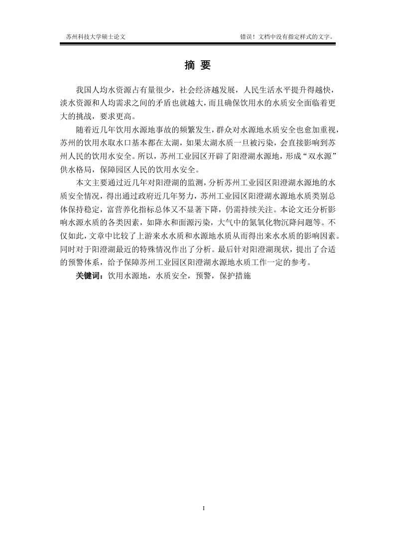 苏州科技大学硕士论文错误!文档中没有指定样式的文字。摘要我国人均水资源占有量很少,社会经济越发展,人民生活水平提升得越快,淡水资源和人均需求之间的矛盾也就越大,而且确保饮用水的水质安全面临着更大的挑战,要求更高。随着近几年饮用水源地事故的频繁发生,群众对水源地水质安全也愈加重视,苏州的饮用水取水口基本都在太湖,如果太湖水质一旦被污染,会直接影响到苏州人民的饮用水安全。所以,苏州工业园区开辟了阳澄湖水源地,形成“双水源”供水格局,保障园区人民的饮用水安全。本文主要通过近几年对阳澄湖的监测,分析苏州工业园区阳澄湖水源地的水质安全情况,得出通过政府近几年努力,苏州工业园区阳澄湖水源地水质类别总体保持稳定,富营养化指标总体又不显著下降,仍需持续关注。本论文还分析影响水源水质的各类因素,如降水和面源污染,大气中的氮氧化物沉降问题等。不仅如此,文章中比较了上游来水水质和水源地水质从而得出来水水质的影响因素。同时对于阳澄湖最近的特殊情况作出了分析。最后针对阳澄湖现状,提出了合适的预警体系,给予保障苏州工业园区阳澄湖水源地水质工作一定的参考。关键词:饮用水源地,水质安全,预警,保护措施苏州科技大学硕士论文错误!文档中没有指定样式的文字。AbstractChina's freshwater resources per capita is extremely scarce.With the rapiddevelopment of social economy,people's living standards gradually improve,thedemand for fresh water resource is becoming more and more big,especially putsforward higher requirements on the water quality security of drinking water.As the source of drinking water in recent years,accidents occur frequently,thecrowd is more and more attention on water quality security,basic in Taihu Lake,Suzhou water intake if the pollution of Taihu lake water quality,the whole Suzhoupeople's drinking water will be affected.So,Suzhou industrial park,opened theYangcheng Lake water source,form a pattern of dual water supply,the drinking watersafety of people in the park.This paper mainly through the recent years of Yangcheng Lake monitoring,waterquality and safety situation analysis of Suzhou Industrial Park Yangcheng Lake water,obtained by the government in recent years of efforts,Suzhou Industrial ParkYangcheng Lake water source water quality remained stable overall,eutrophicationindex of the whole is not significantly reduced,still sustained attention.This paperalso analyzes the various factors that affect the water quality,such as precipitation andnon-point source pollution,atmospheric deposition of nitrogen oxides and so on.Notonly that,this paper compares the upstream water quality and the water quality of thewater source,so as to get the influence factors of water quality.At the same time,therecent special situation of Yangcheng Lake has been analyzed.Finally,according tothe present situation of Yangcheng Lake,a suitable early warning system is putforward to ensure the water quality of Yangcheng Lake water source in SuzhouIndustrial Park.Keyword:drinking water source area,water security,safety warning,protectionmeasures苏州科技大学硕士论文错误!文档中没有指定样式的文字。目录摘要Abstract第一章绪论1.1研究背景及意义1.2拟采取的研究方法和技术手段1.3文献综述.1.3.1国内外相关研究动态与发展前沿1.3.2水质评价方法.….----1.3.3预警体系…第二章阳澄湖水源地(园区段)水质现状评价2.1阳澄湖饮用水源地(园区段)概况.2.1.1地理位置2.1.2气候环境2.1.3水文特征.…82.1.4社会经济.92.1.5阳澄湖(园区段)水源地.92.2水质评价方法…102.2.1湖库水质类别标准的确定…102.2.2水质评价方法102.3阳澄湖水源地(园区段)水质现状的评价2.3.12013-2016年有机污染物指标变化趋势2.3.22013-2016年富营养化指标变化趋势192.3.32013-2016年重金属变化趋势222.3.42013-2016年水质状况变化.….24第三章阳澄湖饮用水源地(园区段)水质影响因素.…27