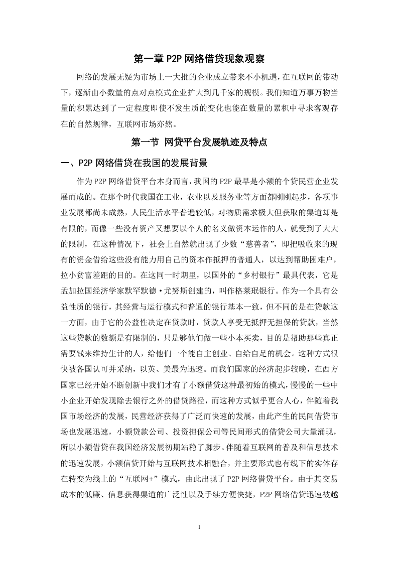 第一章P2P网络借贷现象观察网络的发展无疑为市场上一大批的企业成立带来不小机遇,在互联网的带动下,逐渐由小数量的点对点模式企业扩大到几千家的规模。我们知道万事万物当量的积累达到了一定程度即使不发生质的变化也能在数量的累积中寻求客观存在的自然规律,互联网市场亦然。第一节网贷平台发展轨迹及特点一、P2P网络借贷在我国的发展背景作为P2P网络借贷平台本身而言,我国的P2P最早是小额的个贷民营企业发展而成的。在那个时代我国在工业,农业以及服务业等方面都刚刚起步,各项事业发展都尚未成熟,人民生活水平普遍较低,对物质需求极大但获取的渠道却是有限的,而像一些没有资产又想要以个人的名义做资本运作的人,就受到了大大的限制,在这种情况下,社会上自然就出现了少数“慈善者”,即把吸收来的现有的资金借给这些没有能力用自己的资本作抵押的普通人,以达到帮助困难户,拉小贫富差距的目的。在这同一时期里,以国外的“乡村银行”最具代表,它是孟加拉国经济学家默罕默德·尤努斯创建的,叫作格莱珉银行。作为一个具有公益性质的银行,其经营与运行模式和普通的银行基本一致,但不同的是在贷款这一方面,由于它的公益性决定在贷款时,贷款人享受无抵押无担保的贷款,当然这些贷款的数额是有限制的,只是够他们做一些小本买卖,目的是帮助那些真正需要钱来维持生计的人,给他们一个能自主创业、自给自足的机会。这种方式很快被各国认可并采纳,以英、美最为迅速。而我们国家的经济起步较晚,在西方国家已经开始不断创新中我们才有了小额借贷这种最初始的模式,慢慢的一些中小企业开始发现除去银行之外的借贷路径,而这种方式似乎更合人心,伴随着我国市场经济的发展,民营经济获得了广泛而快速的发展,由此产生的民间借贷市场也发展迅速,小额贷款公司、投资担保公司等民间形式的借贷公司大量涌现,所以小额借贷在我国经济发展初期站稳了脚步。伴随着互联网的普及和信息技术的迅速发展,小额信贷开始与互联网技术相融合,并主要形式也有线下的实体存在转变为线上的“互联网+”模式,由此出现了P2P网络借贷平台。由于其交易成本的低廉、信息获得渠道的广泛性以及手续方便快捷,P2P网络借贷迅速被越来越多的人群所接受并参与其中,随之而来的就是越来越多的各具特色的P2P网络借贷平台的涌现。在2007年的时候,这种新型的线上小额借贷借贷模式传入了中国,到2013年底达到第一个高峰,拒不完全统计已注册的从事P2P网络借贷的网站就达300多家,截至到2018年2月已经有六千多家平台,这些网络融资主要面向无担保、额度小、周期短的小微客户,通过平台的形式将资金融出方和资金融入方进行撮合匹配,并通过网上订立借款合同,网上审查,网上交易资金,来完成整个借贷过程,可见,这种模式完全依赖于互联网。P2P网络借贷平台,是提供网络融资的金融服务网站。它依靠先进的网络技术,为有小额资金投资意向和融资需求的的双方用户提供一个更广泛的网络平台,提高借贷成交率,提升闲置资金的价值增值。这对投资方和需求方都利好的行为却为平台本身带来许多责任,一方面要接受行政部门的监管,另一方面要做好信用审查的工作,如果因为自身信用审查不过关,那么就直接导致投资者要全部承担风险,而平台本身也是难辞其咎的。二、网贷平台的特点首先,相较于银行这样的传统金融机构,P2P网络借贷的内部结构结合市场需求发生了变化。P2P网贷平台属于直接融资,而银行等金融机构的房贷业务属于间接融资。所谓间接融资是指供、求双方不直接发生借贷关系,而是由中介机构来承担债权人的角色,银行是典型的间接融资。而直接融资就是指债权人和债务人因为借贷这一行为直接发生借贷关系,我国现行的P2P网络借贷就是这样,根据社会的需求自由发展,利用互联网的高效性快速配对,一旦有需求方在网上发布资金需求,平台便通过网络为其寻找供应方。这样做到好处是不需要进行银行冗杂的借贷手续,一切操作只需要在网上进行即可,同时这显然有悖于国家对P2P网贷平台的界定要求一一中介机构,致使在监管缺乏严密性和法律体现的滞后性的情况下,产生了大量的问题平台,为金融秩序和社会秩序带来了困扰:其次,平台面向的对象更广泛,受资本市场融资压力的影响,传统的民间融资长期以来大都以中小企业为借贷主体,具有高收益性特点,其利用互联网市场的开放不断吸收,使得交易双方主体的范围不断更新扩大,从传统的中小型企业逐渐扩张至个人及家庭,借贷规模与范围急速扩大,导致借贷参与主体的多元化1俞燕霞:P2P网路借贷平台刑事法律问@探析华东政法大学672特点,但借贷主体的多元化与广泛化也为借贷资金链断裂最终引发信用危机埋下伏笔,一旦发生风险危及主体范围将很难估量:最后,交易网络化,与传统民间借贷相比其最大的特点就是P2P网络借贷是利用互联网思维与互联网技术的民间融资活动。互联网的精神是平等、开放、互助、分享,这使得其在发展的时候能够不受地域与时间界限的限制,能够平等的实现网络借贷信息的分享:同时利用互联网技术在网络上完成比如借款原因及用户身份审核机制一般通过线上完成,交易信息的发布与获得,交易的产生及完成亦是利用互联网完成,即是利用互联