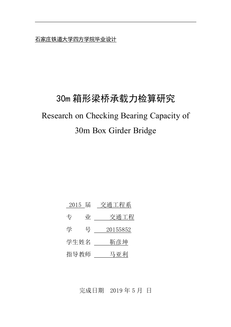 石家庄铁道大学四方学院毕业设计30m箱形梁桥承载力检算研究Research on Checking Bearing Capacity of30m Box Girder Bridge2015届交通工程系专业交通工程学号20155852学生姓名靳彦坤指导教师马亚利完成日期2019年5月日摘要近年以来,车辆超载情况越来越多,且原来越严重,车辆超载可以给路面以及桥梁造成很多不利影响,由于超载可导致桥梁裂缝越来越大,时间久了,桥梁的承载能力必定会因为累积损伤而降低,桥梁的正常使用寿命降低从而达不到使用年限,因此极大可能造成交通事故,故对桥梁的承载能力进行检算研究十分有必要。本文通过查阅相关文献,对研究对象现役跨径30米箱型梁桥承载能力进行了计算,第一步现役桥梁的缺损状况可以通过查看《公路桥梁技术状况评定标准》得出,其次依据各测区回弹值从而求得了混凝土强度,通过规范对该箱型梁桥进行了材质状况评定。最后通过截面类型计算出了该配筋混凝土桥梁的承载能力,运用迈达斯软件建立模型,根据静载实验结果计算出该桥梁的理论承载能力,通过折损计算该现役桥梁的承载能力与理论承载能力作比较,推算出该现役桥梁承载能力是否满足公路Ⅱ级要求。关键词:箱型桥、混凝土强度、病害分析、恶化系数、折减系数AbstractIn recent years,there have been more and more overloaded vehicles,and the more serious the original,theoverload of vehicles can cause many adverse effects on roads and bridges.Because overload can lead to bridgecracks becoming bigger and bigger.Over a long period oftime,the bearing capacity ofbridge will be reducedbecause of cumulative damage,and the nommal service life ofbridge will be reduced so that the service life ofbridge can not reach the service life,so traffic may be caused greatly.Therefore,it is necessary to conduct acheck on the bearing capacity ofthe bridge.Through consulting relevant literature,this paper calculates the bearing capacity of theexisting 30-meter-"Evaluation Criteriafor Technical Conditions of Highway Bridges",then calculates the concrete strengthaccording to the rebound value ofeach measuring area,and evaluates the material condition ofthe box girderbridge by the criteria.At last,the bearing capacity ofthe reinforced concrete bridge is calculated by section type,the model is established by Midas software,the theoretical bearing capacity ofthe bridge is calculated by staticload test results,and the bearing capacity ofthe existing bridge is calculated by comparing the theoreticalbearing capacity with the theoretical bearing capacity through damage calculation,and whether the bearingcapacity ofthe existing bridge meets the requirements of grade II highway is calculated.Key words:Box Bridge,Concrete Strength,Disease Analysis,Deterioration Coefficientand Reduction Coefficient