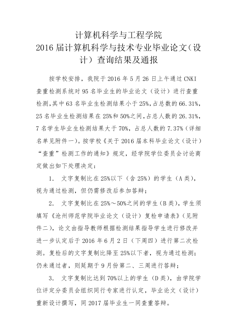 计算机科学与工程学院2016届计算机科学与技术专业毕业论文(设计)查询结果及通报按学校安排,我院于2016年5月26日上午通过CNKI查重检测系统对95名毕业生的毕业论文(设计)进行查重检测,其中63名毕业生检测结果小于25%,占总数的66.31%,25名毕业生检测结果在25%和50%之间,占总人数的26.31%,7名学生毕业生检测结果大于70%,占总人数的7.37%(详细名单见附件一)。按学校《关于2016届本科毕业论文(设计)“查重”检测工作的通知》规定,经学院学位委员会讨论商定做出如下处理决定:1.文字复制比在25%以下(含25%)的学生(A类),视为通过检测,但仍需修改后参加答辩:2.文字复制比在25%~50%之间的学生(B类),学生须填写《沧州师范学院毕业论文(设计)复检申请表》(见附件二),论文由指导教师根据检测结果指导学生进行修改并进一步认定后于2016年6月2日(下周四)进行第二次检测。复检后的文字复制比降至25%以下者,视为通过检测;仍未通过者,则延期于9月份第二、三周进行答辩;3.文字复制比达到70%以上的学生(D类),由学院学位评定分委员会组织同行专家进行认定,毕业论文(设计)重新设计撰写,同2017届毕业生一同查重答辩。计算机科学与工程学院2016年5月26日附件一:2016届毕业论文(设计)查重结果2016年5月26日检测重合总字去除去除指导学号作者论文题目结果字数数引用本人教师1211212124李永磊基于安卓平台的健康知识系统的设计与实现0.40%3082540.40%0.40%刘凤华1211212111刘晓基于I0S的“逛e逛”旅游软件的设计与开发0.80%6070790.80%0.80%刘春玉1411312130张明月基于ASP.NET的教师资格证网上报名系统的设计与实现2%19697672%2%宋连友1211212133王正明沧州师范学院毕业论文选题系统的设计与实现2.40%569234052.40%2.40%樊文超1211212103常兵校园二手商品交易网的设计与开发2.60%281108222.60%2.60%朱美玲1211212101班蕊基于SpringMVC的影音光盘管理系统的设计与实现2.80%28098352.80%2.80%刘春玉1411312114石中宏五子棋游戏的设计与实现(基于JAVA)2.90%26291072.90%2.90%1211212115赵浩计算机等级考试考场划分系统的设计与实现3.30%31393643.30%3.30%刘丹1211212122李新海沧州市团员信息管理系统3.30%758229163.30%3.30%樊文超1211212130刘云校园文化交流网站的设计与实现3.30%33199403.30%3.30%倪晓红1211212110刘娜娜基于i0S“新闻看不停”应用系统的设计与实现4%36590533%4%刘春玉1411312142李博基于Java Web的药店药品进销存管理系统4%37293584%4%刘国香1411312128张洪果基于ASP.NET求职网的设计与实现4.50%457101463.70%4.50%#N/A