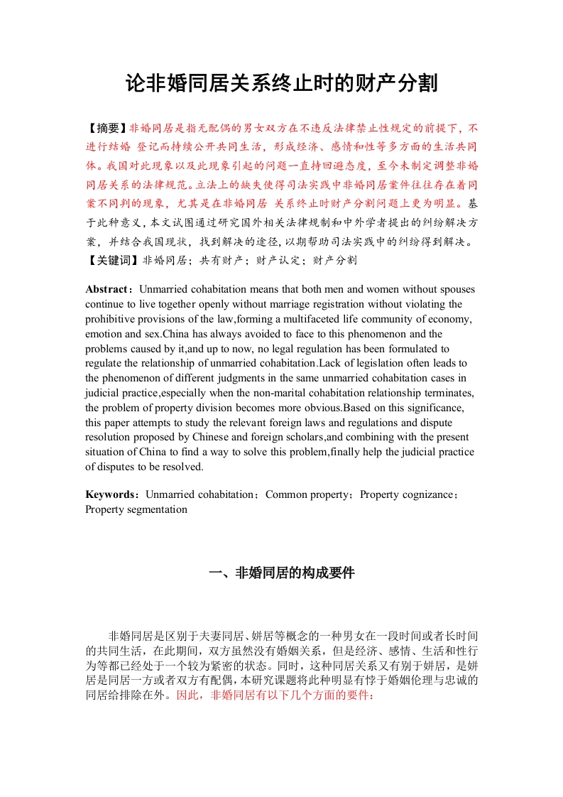 论非婚同居关系终止时的财产分割【摘要】非婚同居是指无配偶的男女双方在不违反法律禁止性规定的前提下,不进行结婚登记而持续公开共同生活,形成经济、感情和性等多方面的生活共同体。我国对此现象以及此现象引起的问题一直持回避态度,至今未制定调整非婚同居关系的法律规范。立法上的缺失使得司法实践中非婚同居案件往往存在着同案不同判的现象,尤其是在非婚同居关系终止时财产分割问题上更为明显。基于此种意义,本文试图通过研究国外相关法律规制和中外学者提出的纠纷解决方案,并结合我国现状,找到解决的途径,以期帮助司法实践中的纠纷得到解决。【关键词】非婚同居:共有财产:财产认定;财产分割Abstract:Unmarried cohabitation means that both men and women without spousescontinue to live together openly without marriage registration without violating theprohibitive provisions of the law,forming a multifaceted life community of economy,emotion and sex.China has always avoided to face to this phenomenon and theproblems caused by it,and up to now,no legal regulation has been formulated toregulate the relationship of unmarried cohabitation.Lack of legislation often leads tothe phenomenon of different judgments in the same unmarried cohabitation cases injudicial practice,especially when the non-marital cohabitation relationship terminates,the problem of property division becomes more obvious.Based on this significance,this paper attempts to study the relevant foreign laws and regulations and disputeresolution proposed by Chinese and foreign scholars,and combining with the presentsituation of China to find a way to solve this problem,finally help the judicial practiceof disputes to be resolved.Keywords:Unmarried cohabitation:Common property:Property cognizance;Property segmentation一、非婚同居的构成要件非婚同居是区别于夫妻同居、姘居等概念的一种男女在一段时间或者长时间的共同生活,在此期间,双方虽然没有婚姻关系,但是经济、感情、生活和性行为等都已经处于一个较为紧密的状态。同时,这种同居关系又有别于姘居,是姘居是同居一方或者双方有配偶,本研究课题将此种明显有悖于婚姻伦理与忠诚的同居给排除在外。因此,非婚同居有以下几个方面的要件:(一)主体要件第一,非婚同居的主体应当是不存在与第三人有婚姻关系或有同居情形,即双方都不得有婚姻法上的配偶,也不得同时存在两个及以上的同居关系。我国婚姻法以一夫一妻为基本原则,保护合法的婚姻关系及维护婚姻关系的稳定是婚烟法的重要原则,如果同居一方是有配偶的,那么其明显违背了夫妻之间应负的忠诚义务也明显违反了婚姻法的规定,根据其情形可能构成重婚、姘居等。同时,非婚同居亦具有排外性,即对于双方来说此同居关系是唯一的,不得同时存在其他的同居关系。第二,双方都应当具有完全民事行为能力,在非婚同居中的一个一个重要特征就是双方在经济上的法律关系频繁产生,需要双方都具有对自身权利的有权处分及能够承担相应的法律责任,由此,笔者认为双方都应当具有完全民事行为能力。第三,非婚同居的主体应当是满足法定结婚条件,不存在婚姻障碍。根据婚烟法的规定,这就要求双方应当是异性且双方皆已达到法定的结婚年龄,亦不存在其他法律禁止结婚的情形。虽然当前美国等部分国家已经承认了同性婚姻,但是我国对同性婚姻仍然持禁止态度,同性恋在我国历经流氓罪、精神病患者,目前社会以及国家已经较为宽容,虽然在婚姻法上禁止结婚,但是对其态度已经是不保护、不禁止、不干预。即使如此,由于同性婚姻没有婚姻法的基础,因此,同性同居不在本文的研究范围之内。(二)主观要件在主观状态上,非婚同居与缔结婚姻的主观状态是一致的,即要求双方都完全是自愿的,对非婚同居状态是双方自我真实意思表示。因此,对于因胁迫、欺诈等原因形成的同居状态并不一定属于非婚同居,受害一方因此做出的权利处分的状态也处于待定的状态。但对是否要求双方具有缔结婚姻的意愿,非婚同居并不要求,可能一方愿意缔结婚姻而另一方并无缔结婚姻的意愿,也可能双方都没有缔结婚姻的意愿,这些都是双方自我选择的领域,法律并未进行强制性规定。这也有利于对双方权益的公平保护。因此,主观要件仅为双方自愿同居,而不包含肆后结婚的意思表示。(三)客观要件在非婚同居的具体行为表现上,即其客观要件应当包含两个方面。首先是双方应当有着共同生活的行为外在表现。共同生活是一个概括性的概念,其含义包含着共同居住、社交关系、性生活、娱乐等,非婚同居的双方在这些领域结成了一个较为固定的关系。《埃塞俄比亚民法典》将类似于已婚者的外在为表现作为非同居关系成立的前提和必须的行为表现,从一定程度上来讲,非婚同居生活与婚烟家庭生活是有一定的关系和相似性的。其次,这种双方的共同生活应当是稳定和相对长期的。虽然人类的感情易变,但是为了与单纯的性交行为如一夜情等区分开来,非婚同居要求其共同生活存续一段时间,而不是短时间激情行为。1参见《民法总则》第17、18条,由于我国法定结婚年龄为男性22周岁,女性20周岁,故不考虑“十六周岁以上的未成年人,以自己的劳动收入为主要生活来源的,视为完全民事行为能力人”这一情况2杨鸿台:《同居法律规制研巧》,中国书籍出版社,2011年版,第251页当然各个国家对其存续的具体时间受到其